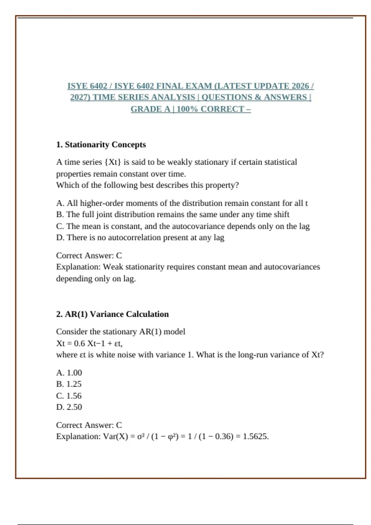 Prepare effectively for the ISYE 6402 Time Series Analysis Final Exam with our comprehensive collection of practice questions and answers. Covering topics from stationarity, ARIMA modeling, forecasting, seasonality, GARCH, VAR, and structural breaks, these exam-style questions (Q1–160) are designed to mirror real test formats. Each question includes multiple-choice options (A–D), correct answers, and clear explanations to strengthen your understanding. Ideal for students, professionals, and data analysts aiming for top grades in 2025–2026. Boost your confidence, master key concepts, and achieve exam success with this structured, high-quality time series study resource. Perfect for final exam revision
