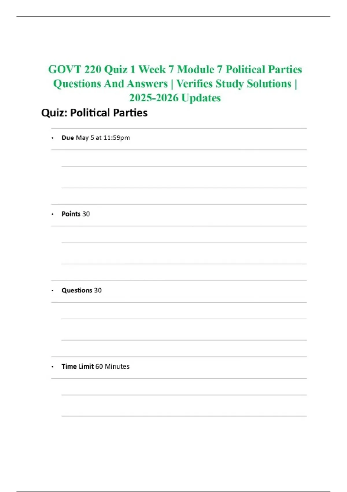 GOVT 220 Quiz 1 Week 7 Module 7 Political Parties Questions And Answers | Verifies Study Solutions | Updates