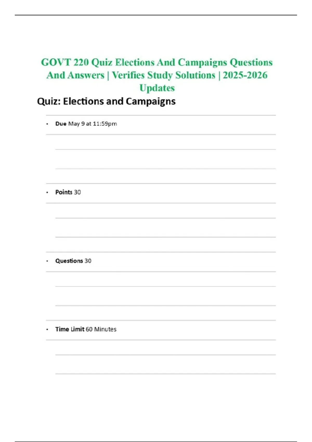 GOVT 220 Quiz Elections And Campaigns Questions And Answers | Verifies Study Solutions | Updates
