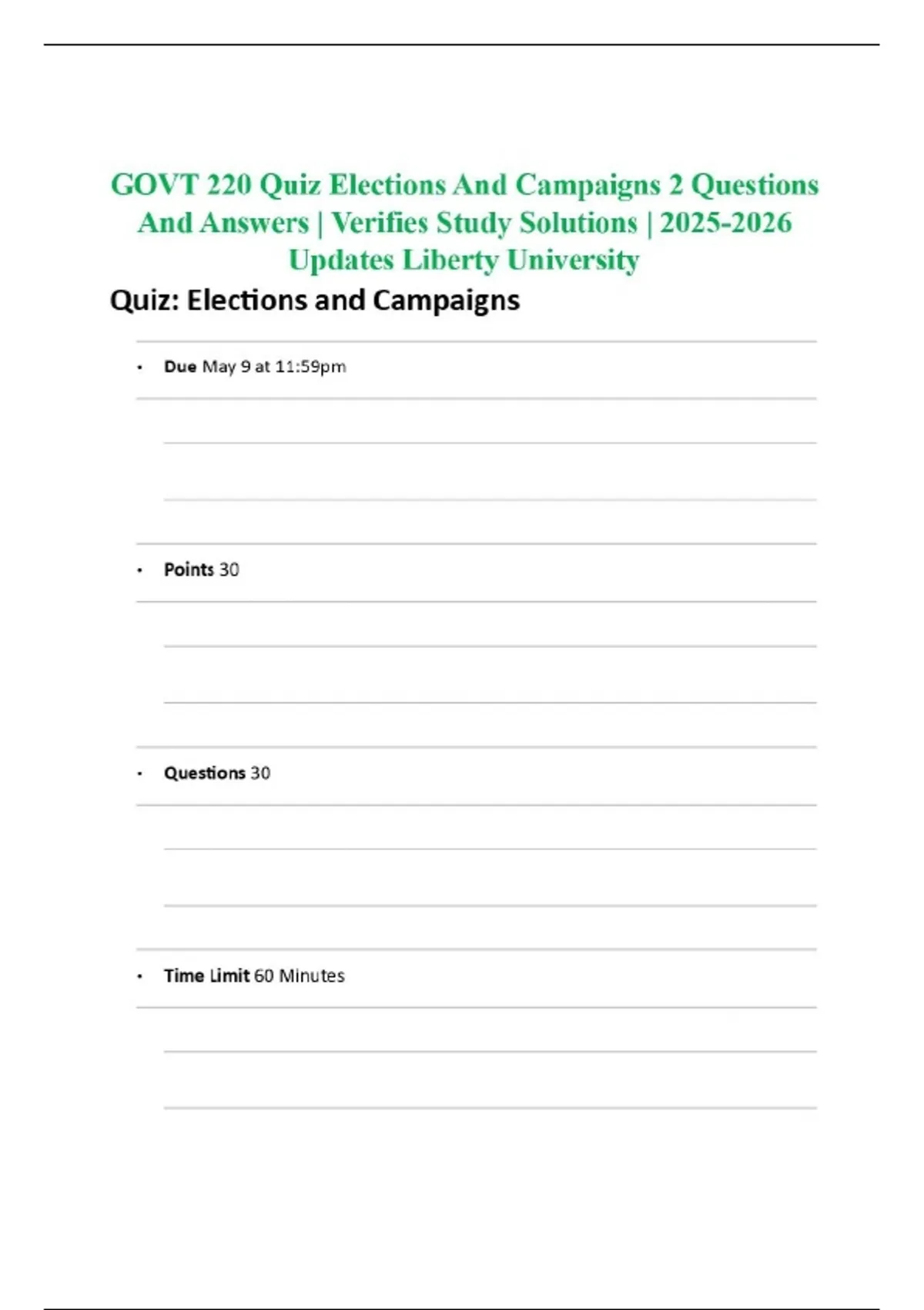 GOVT 220 Quiz Elections And Campaigns 2 Questions And Answers | Verifies Study Solutions | Updates Liberty University