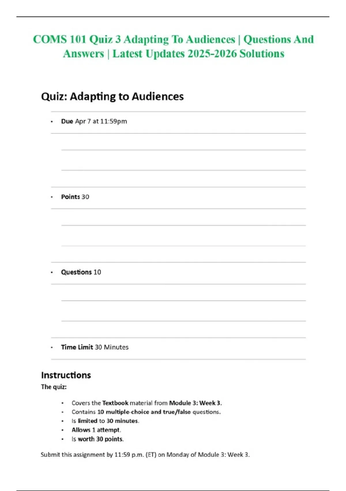 COMS 101 Quiz 3 Adapting To Audiences | Questions And Answers | Latest Updates Solutions