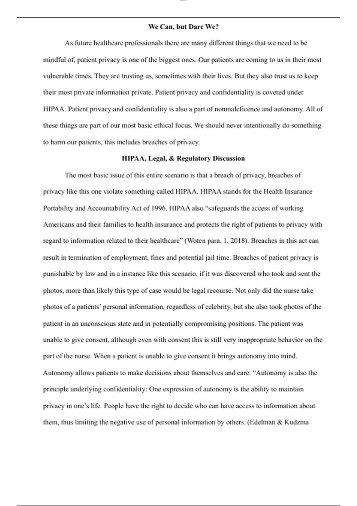 HIPAA. Patient privacy and confidentiality is also a part of nonmaleficence and autonomy. All of