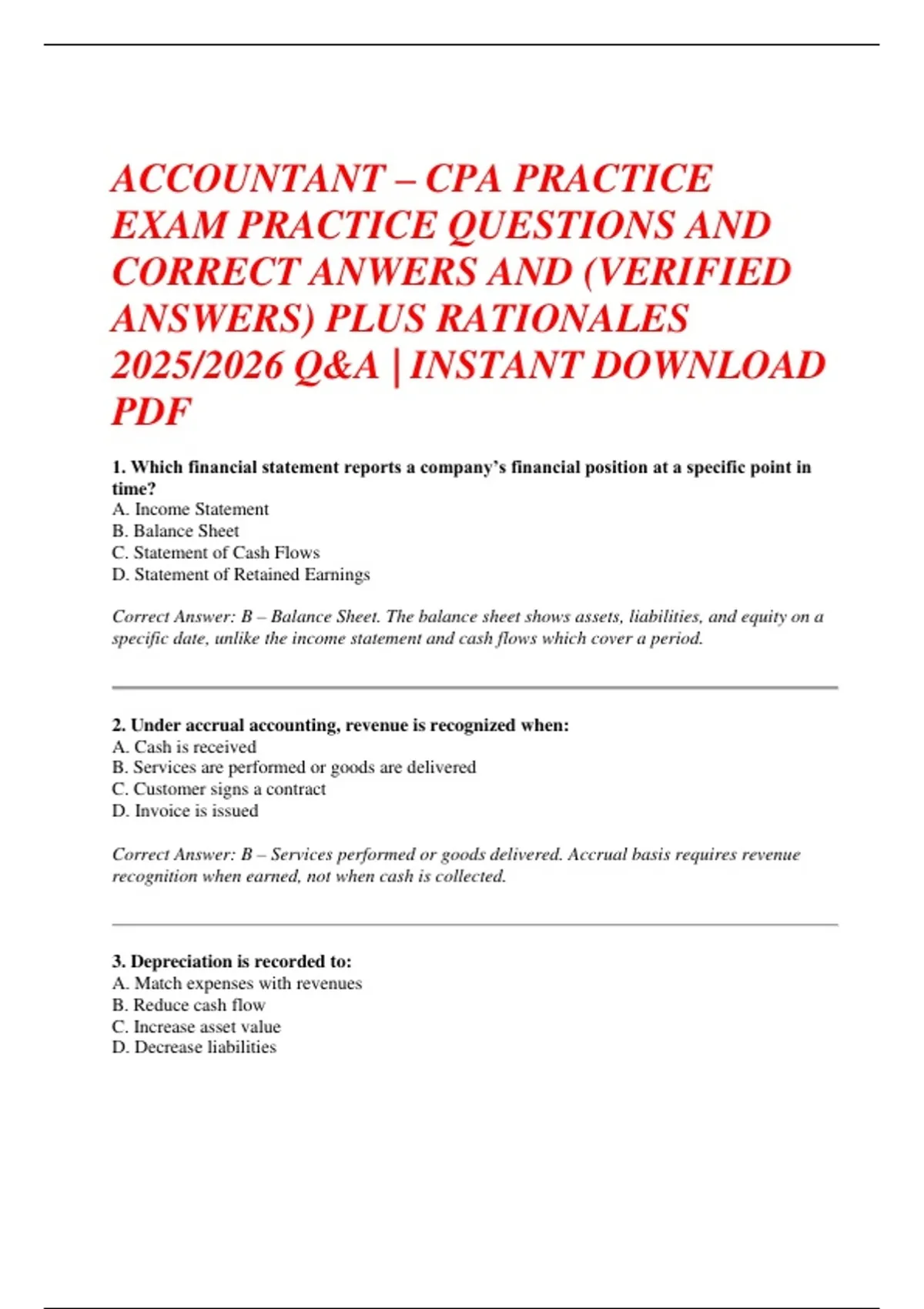Correct Answer: B – Services performed or goods delivered. Accrual basis requires revenue