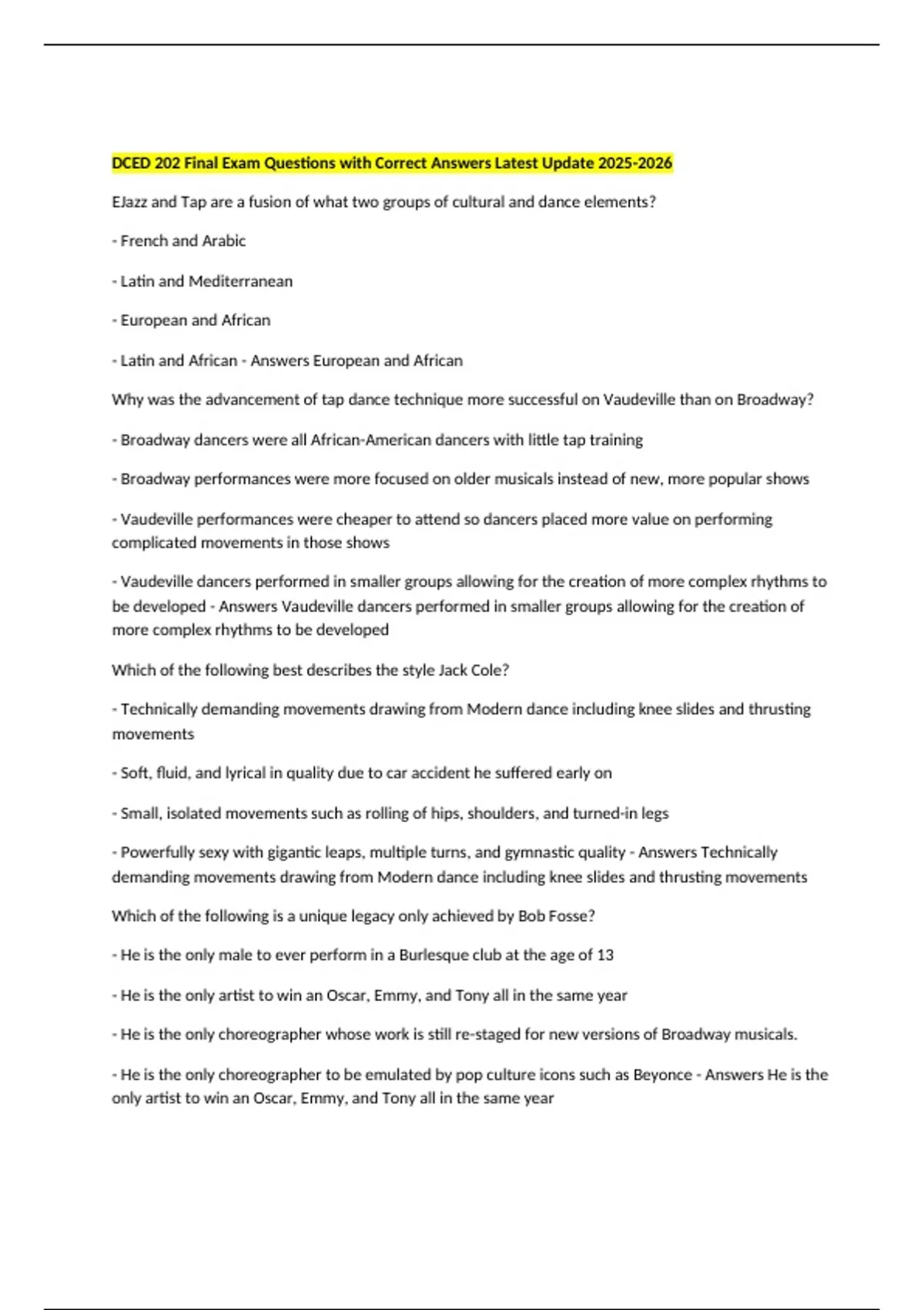 DCED 202 Final Exam Questions with Correct Answers Latest Update EJazz and Tap are a fusion of what two groups of cultural and dance elements? - French and Arabic - Latin and Mediterranean - European and African - Latin and African - Answers European and African Why was the advancement of tap dance technique more successful on Vaudeville than on Broadway? - Broadway dancers were all African-American dancers with little tap training - Broadway performances were more focused on older musicals instead of new, more popular shows - Vaudeville performances were cheaper to attend so dancers placed more value on performing complicated movements in those shows - Vaudeville dancers performed in smaller groups allowing for the creation of more complex rhythms to be developed - Answers Vaudeville dancers performed in smaller groups allowing for the creation of more complex rhythms to be developed Which of the following best describes the style Jack Cole? - Technically demanding movements drawing from Modern dance including knee slides and thrusting movements - Soft, fluid, and lyrical in quality due to car accident he suffered early on - Small, isolated movements such as rolling of hips, shoulders, and turned-in legs - Powerfully sexy with gigantic leaps, multiple turns, and gymnastic quality - Answers Technically demanding movements drawing from Modern dance including knee slides and thrusting movements Which of the following is a unique legacy only achieved by Bob Fosse? - He is the only male to ever perform in a Burlesque club at the age of 13 - He is the only artist to win an Oscar, Emmy, and Tony all in the same year - He is the only choreographer whose work is still re-staged for new versions of Broadway musicals. - He is the only choreographer to be emulated by pop culture icons such as Beyonce - Answers He is the only artist to win an Oscar, Emmy, and Tony all in the same year Which of the following best describes Fosse's choreographic style? - Soft, fluid, articulate and graceful movements with lots of upper body emphasis - Powerful knee slides, thrusting movements, and highly technical feats - Powerful, sexy and extremely aggressive, traditionally masculine movements - Emphasis on isolated movements such as rolling of hips, shoulders, and turned-in legs - Answers Emphasis on isolated movements such as rolling of hips, shoulders, and turned-in legs What defines the tap dance style of Bill "Bojangles" Robinson? - An upright, European styled body with weight more on the balls of the feet - A downward, crouched African style with weight more on the heels - A fusion of European dance styles and African musical rhythms - A highly improvisational exploration of complex rhythms - Answers An upright, European styled body with weight more on the balls of the feet The "stair dance" was created by which tapper who brought tap up onto the toes? - Nicholas Brothers - Shirley Temple - Bill Robinson - Gene Kelly - Answers Bill Robinson Which early tap dance icon was famous for being one of the first dancers to fuse European dance styles with African musical rhythms? - John C. Bubbles - Bill "Bojangles" Robinson - William Henry Lane - The Nicholas Brothers - Answers William Henry Lane Which early tapper created complex, contemporary rhythms in a slightly more African style? - John Buck - Bill "Bojangles" Robinson - William Henry Lane