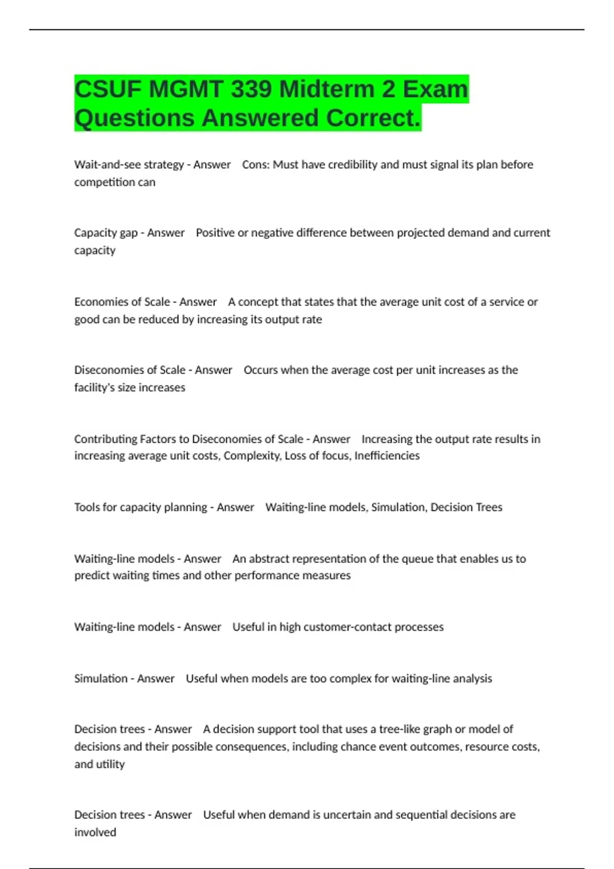 CSUF MGMT 339 Midterm 2 Exam Questions Answered Correct.