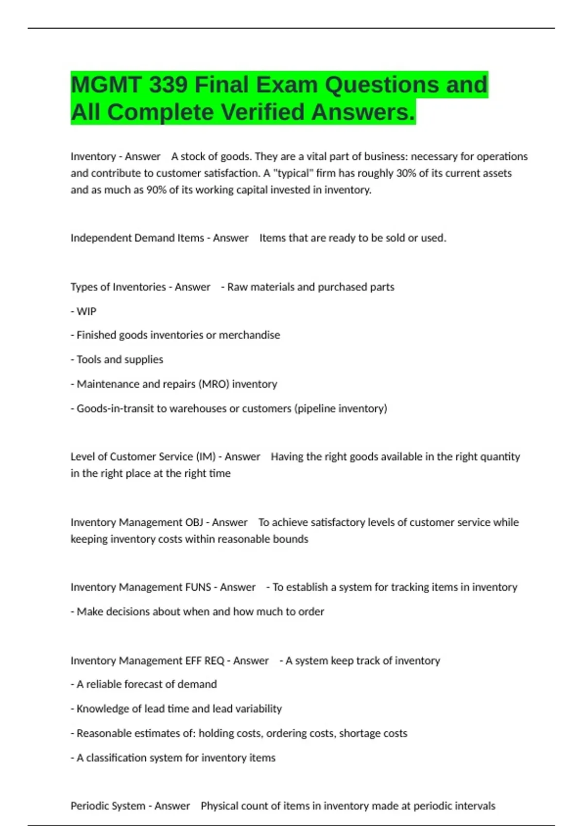 MGMT 339 Final Exam Questions and All Complete Verified Answers.