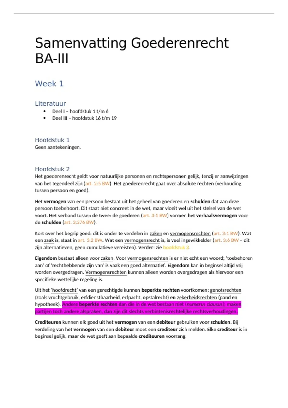 Een 91 pagina lange samenvatting voor het vak Goederenrecht. Deze samenvatting biedt allereerst per week een overzicht van alle literatuur, hoorcolleges, kennisclips en jurisprudentie. Het gedeelte 'literatuur' is telkens onderverdeeld in de voorgeschreven hoofdstukken. De jurisprudentie bevat telkens het onderwerp, de kern en de belangrijkste rechtsoverweging(en). Daarna zijn per week alle opdrachten en de antwoorden uitgewerkt. Het oefententamen (5 vragen) is ook inbegrepen.