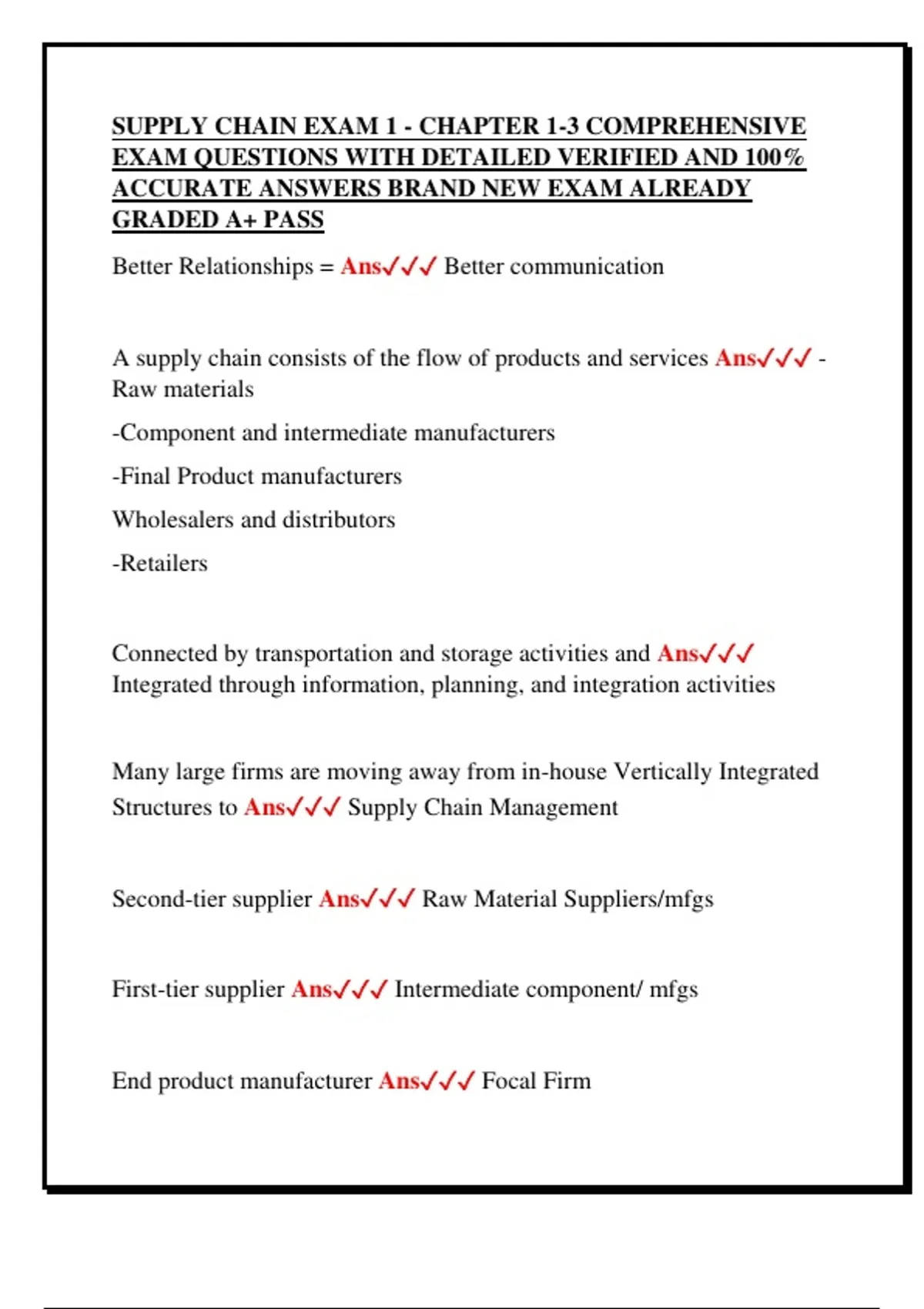 SUPPLY CHAIN EXAM 1 - CHAPTER 1-3 COMPREHENSIVE EXAM QUESTIONS WITH DETAILED VERIFIED AND 100% ACCURATE ANSWERS BRAND NEW EXAM ALREADY GRADED A+ PASS