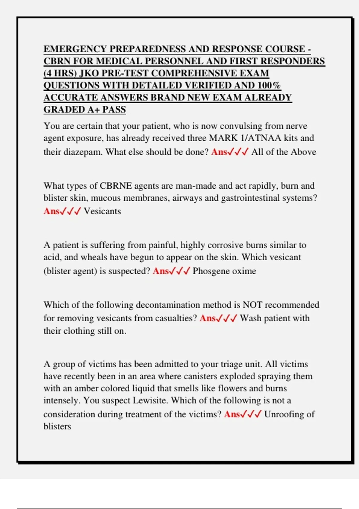 EMERGENCY PREPAREDNESS AND RESPONSE COURSE - CBRN FOR MEDICAL PERSONNEL AND FIRST RESPONDERS (4 HRS) JKO PRE-TEST COMPREHENSIVE EXAM QUESTIONS WITH DETAILED VERIFIED AND 100% ACCURATE ANSWERS BRAND NEW EXAM ALREADY GRADED A+ PASS