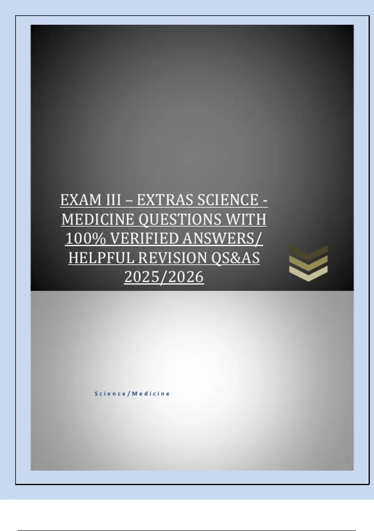 EXAM III – EXTRAS SCIENCE - MEDICINE QUESTIONS WITH 100% VERIFIED ANSWERS/ HELPFUL REVISION QS&AS 2025/2026 When should a woman start getting Pap tests? A. When she becomes sexually active B. At age 21 C. During her first pregnancy D. Before birth control is prescribed - Correct Answer-Answer B Women are advised to begin Pap testing either 3 years after the onset of vaginal intercourse or at the age of 21, whichever comes first. For a young teenager, birth control may be prescribed without first performing a pelvic exam Mimi, age 52, asks why she should perform a monthly breast self-examination (BSE) when she has an annual exam by the physician, as well as a yearly mammogram. You respond, A. "If you are faithful about your annual exams and mammograms, that is enough. " B. "More breast abnormalities are picked up by mammograms than by clinical exams or BSE. " C. "More than 90% of all breast abnormalities are first detected by self-examination. " D. "Self-examinations need to be performed only every other month. " - Correct Answer-Answer C More than 90% of all breast abnormalities are first detected by self-examination. All women older than age 20 should examine their breasts monthly, a week after their period. After menopause, women should examine their breasts at the same time each month. Screening test recommendations for HIV infection include A. all clients. B. persons getting married. C. teenagers who have been sexually active for 1 year. D. intravenous drug users and clients with high-risk behaviors. - Correct Answer-Answer D The Centers for Disease Control and Prevention recommend that all clients with high-risk behaviors be encouraged to be screened for HIV antibodies to identify those who are already infected so that interventions can be started to further halt the spread of the virus Bone density studies to screen for osteoporosis should be performed on which of the following? A. Perimenopausal women who used to smoke but no longer do B. Only on women after menopause C. All women who have had hysterectomies D. Women with drinking problems Continues....
