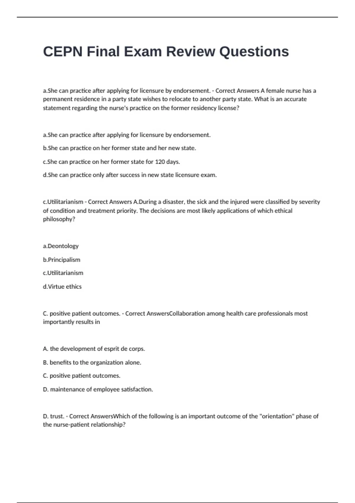 a.She can practice after applying for licensure by endorsement. - Correct Answers A female nurse has a permanent residence in a party state wishes to relocate to another party state. What is an accurate statement regarding the nurse's practice on the former residency license? a.She can practice after applying for licensure by endorsement. b.She can practice on her former state and her new state. c.She can practice on her former state for 120 days. d.She can practice only after success in new state licensure exam. c.Utilitarianism - Correct Answers A.During a disaster, the sick and the injured were classified by severity of condition and treatment priority. The decisions are most likely applications of which ethical philosophy? a.Deontology b.Principalism c.Utilitarianism d.Virtue ethics C. positive patient outcomes. - Correct AnswersCollaboration among health care professionals most importantly results in A. the development of esprit de corps. B. benefits to the organization alone. C. positive patient outcomes. D. maintenance of employee satisfaction. D. trust. - Correct AnswersWhich of the following is an important outcome of the "orientation" phase of the nurse-patient relationship? A. communication. B. understanding. C. acceptance. D. trust. C. conveying acceptance of the patient in with a nonjudgmental attitude - Correct AnswersWhich behaviors help patients to develop trust? A. answering questions with authority B. sharing personal information to indicate openness C. conveying acceptance of the patient in with a nonjudgmental attitude D. Telling the patient that he or she can trust you C. Demonstrating caring behavior in spite of negative feelings - Correct AnswersWhich of the following best illustrates nonjudgmental acceptance of the patient? A. Using professional influence to change a patient's morality to be more in keeping with societal norms B. Changing your assignment if you discover that you have negative feelings toward your patient's lifestyle C. Demonstrating caring behavior in spite of negative feelings D. Avoiding all negative feelings about the patient C. Working phase - Correct AnswersA newly diagnosed diabetic Pt states "I have very definite likes and dislikes when it comes to food. Am I going to have to eat only certain foods, or will I have some choice?" The nurse responds, "I will request a dietary consultation to include your preferences and still come up with a good diet for controlling your diabetes. If you want, you can start thinking about or writing a list of your likes and dislikes. What phase of the nurse-patient relationship is this? A. Relationship phase B. Orientation phase C. Working phase D. Termination phase C. Emphasizing the achievements the patient has made, including the ability for self-care - Correct AnswersThe nurse and patient may experience sadness during the termination phase. How can the nurse help the patient be successful in the termination phase of the nurse-patient relationship? A. Providing personal contact information so the patient can contact the nurse if needed B. Visiting the patient at home during off-duty time to help the transition to self-care C. Emphasizing the achievements the patient has made, including the ability for self-care D. Exchanging goodbye gifts as a sign that the relationship is terminated D. The nonverbal communication may be a more reliable message. - Correct AnswersWhich is true of verbal and nonverbal communication? A. Verbal messages are more important than nonverbal cues. B. Individuals can exercise more control over nonverbal communication. C. Verbal and nonverbal communication always match. D. The nonverbal communication may be a more reliable message. D. The nurse manager sits with you in the nurse's lounge and asks, "Is there anything you would like to talk about?" - Correct AnswersWhich of the following could be considered congruent communication? A. The nurse manager states, "Come by my office anytime." Then she keeps her door closed and does not answer phone calls. B. As a co-worker hurries down the hall, he asks, "Is there anything you need help with?" C. As she drops a stack of charts loudly on the desk, a co-worker states, "This is going to be a wonderful day." D. The nurse manager sits with you in the nurse's lounge and asks, "Is there anything you would like to talk about?" A. incongruence between verbal and nonverbal messages. - Correct AnswersA nurse is irrigating pressure ulcers on a patient's coccyx. When the patient asks how they are healing, the nurse grimaces and says, "Oh, they're doing just fine." This is A. incongruence between verbal and nonverbal messages. B. a confirming statement. C. objectivity in responding to the question. D. the therapeutic use of humor. B. "How are you?" C. "How do you feel about staying with your daughter?" D. "What would you like to discuss today while we take a walk?" - Correct AnswersWhich of the following are examples of open-ended questions? (Select all that apply) A. "Ms. Goode, did you have a productive therapy session?" B. "How are you?" C. "How do you feel about staying with your daughter?" D. "What would you like to discuss today while we take a walk?" E. "Are you having that problem with arthritis in your hand again?" A. Encouraging the speaker by saying, "Tell me more" C. Sitting in an open posture such as leaning forward E. Good eye contact at eye level and nodding of the head - Correct AnswersWhich behaviors foster active listening? (Select all that apply) A. Encouraging the speaker by saying, "Tell me more" B. Limiting complaining because it is not productive C. Sitting in an open posture such as leaning forward D. Engagement in a task E. Good eye contact at eye level and nodding of the head B. allow the patient to not feel pressured to provide information. - Correct AnswersWithin nurse-patient communication, the use of silence can A. block further therapeutic communication. B. allow the patient to not feel pressured to provide information. C. 