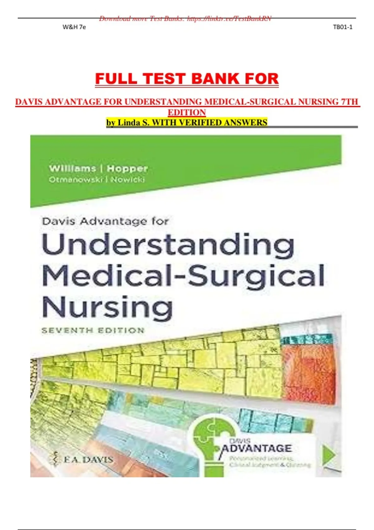 TEST BANK FOR DAVIS ADVANTAGE FOR UNDERSTANDING MEDICAL-SURGICAL NURSING 7TH EDITION TEST BANK FOR DAVIS ADVANTAGE FOR UNDERSTANDING MEDICAL-SURGICAL NURSING 7TH EDITION