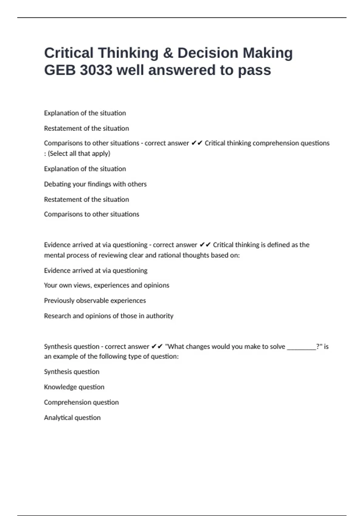 Comparisons to other situations - correct answer ✔✔ Critical thinking comprehension questions
