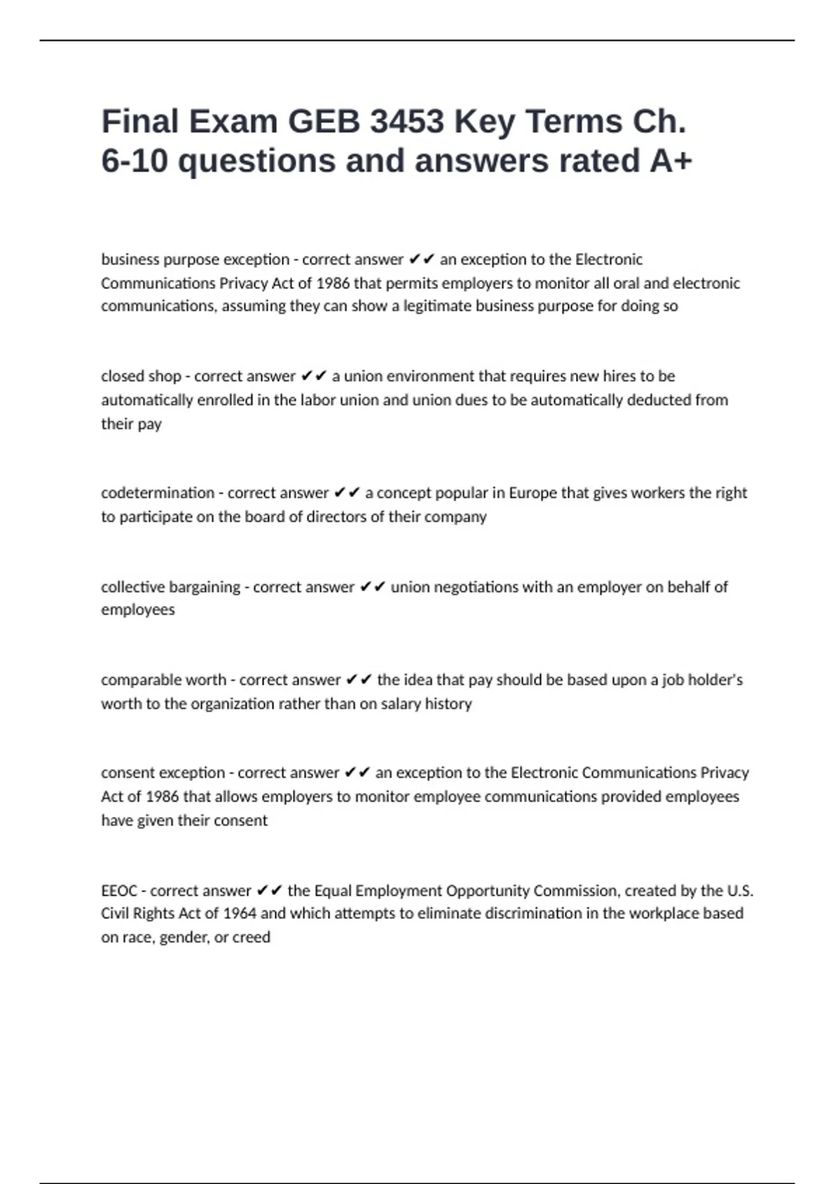 Final Exam GEB 3453 Key Terms Ch. 6-10 questions and answers rated A+