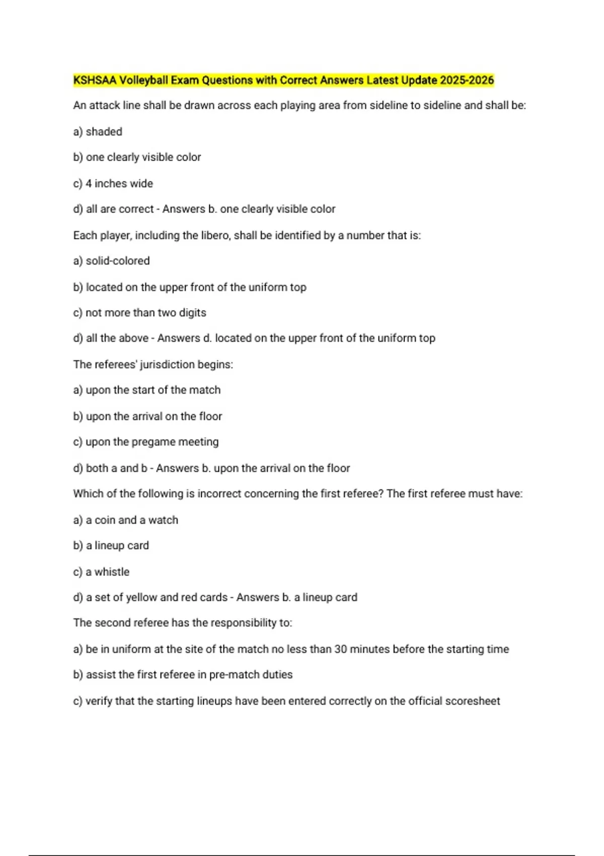KSHSAA Volleyball Exam Questions with Correct Answers Latest Update An attack line shall be drawn across each playing area from sideline to sideline and shall be: a) shaded b) one clearly visible color c) 4 inches wide d) all are correct - Answers b. one clearly visible color Each player, including the libero, shall be identified by a number that is: a) solid-colored b) located on the upper front of the uniform top c) not more than two digits d) all the above - Answers d. located on the upper front of the uniform top The referees' jurisdiction begins: a) upon the start of the match b) upon the arrival on the floor c) upon the pregame meeting d) both a and b - Answers b. upon the arrival on the floor Which of the following is incorrect concerning the first referee? The first referee must have: a) a coin and a watch b) a lineup card c) a whistle d) a set of yellow and red cards - Answers b. a lineup card The second referee has the responsibility to: a) be in uniform at the site of the match no less than 30 minutes before the starting time b) assist the first referee in pre-match duties c) verify that the starting lineups have been entered correctly on the official scoresheet d) all are second referee responsibilities - Answers d. all are second referee The second referee shall confirm with the scorer the initial unnecessary delay warning and second and subsequent unnecessary delay penalties during a set by: a) a coach b) a player c) a substitute d) all of the above - Answers d. all of the above A re-serve shall be called when: a) the server releases the ball for service, then catches the ball b) the ball contacts the backboard or its supports hanging in a vertical position c) the server steps on the service line d) the server contacts the ball outside the hashmark - Answers a. the server releases the ball for service, then catches the ball Substitution requests are not permitted: a) at the beginning of a time-out b) after a replay is signaled c) after a re-serve is signaled d) all of the above are correct - Answers d. all of the above are correct Which of the following statements is accurate in relation to net play: a) a ball contacting and crossing the net shall remain in play provided contact is entirely within the net antennas b) a player shall not contact a ball which is completely on the opponent's side of the net unless the contact is a legal block c) recovering a ball hit into the net shall be permitted d) all of the above are correct - Answers d. all of the above are correct When multiple courts are used, the second referee may end a time-out or interval between sets with a: A. Audio signal (horn). B. Double whistle. C. Beckon for serve. D. Whistle. - Answers d. whistle During the set, each line judge shall assist the referees by: A. Communicating with the first referee when asked, when the ball touches the ceiling or overhead obstruction, if out of the view of the referees. B. Indicating when the ball touches the net, net antennas, and/or net supports not entirely between the net antennas. C. Indicating when a player touches a ball that is going out of bounds on the player's side of the net. D. All are correct. - Answers d. all are correct . During a dead ball, the playing captain may request the following for the captain's team: A. A time-out.