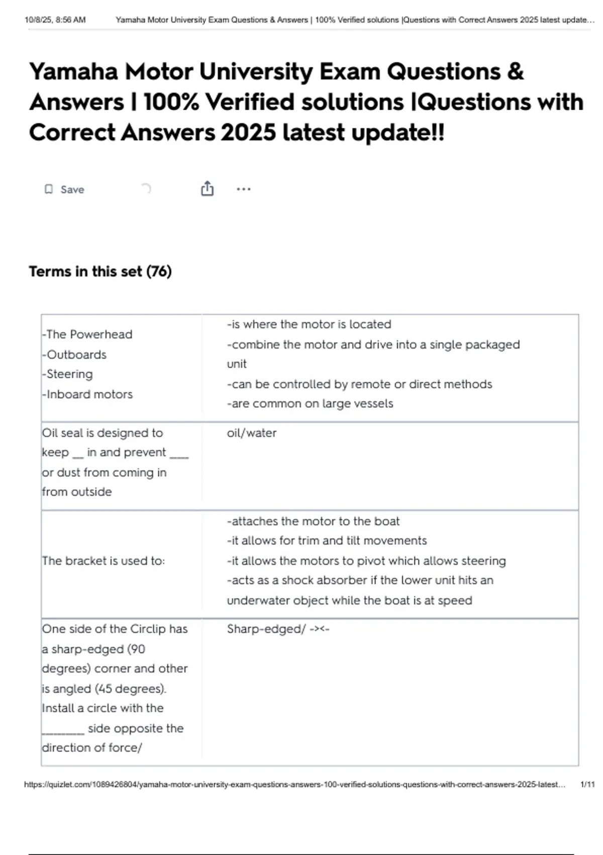 , 10/8/25, 8:56 AM Yamaha Motor University Exam Questions & Answers | 100% Verified solutions |Questions with Correct Answers 2025 latest update…