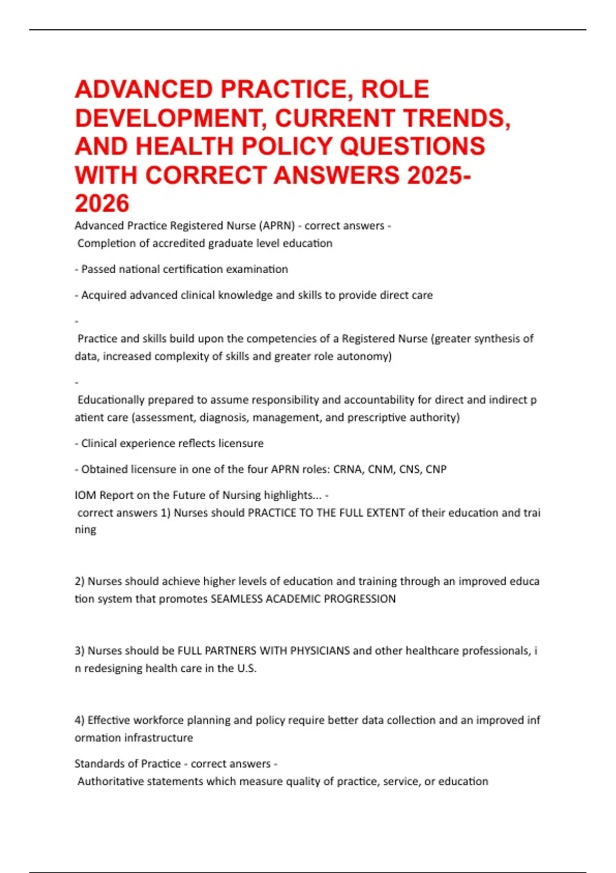 ADVANCED PRACTICE, ROLE DEVELOPMENT, CURRENT TRENDS, AND HEALTH POLICY QUESTIONS WITH CORRECT ANSWERS 2025