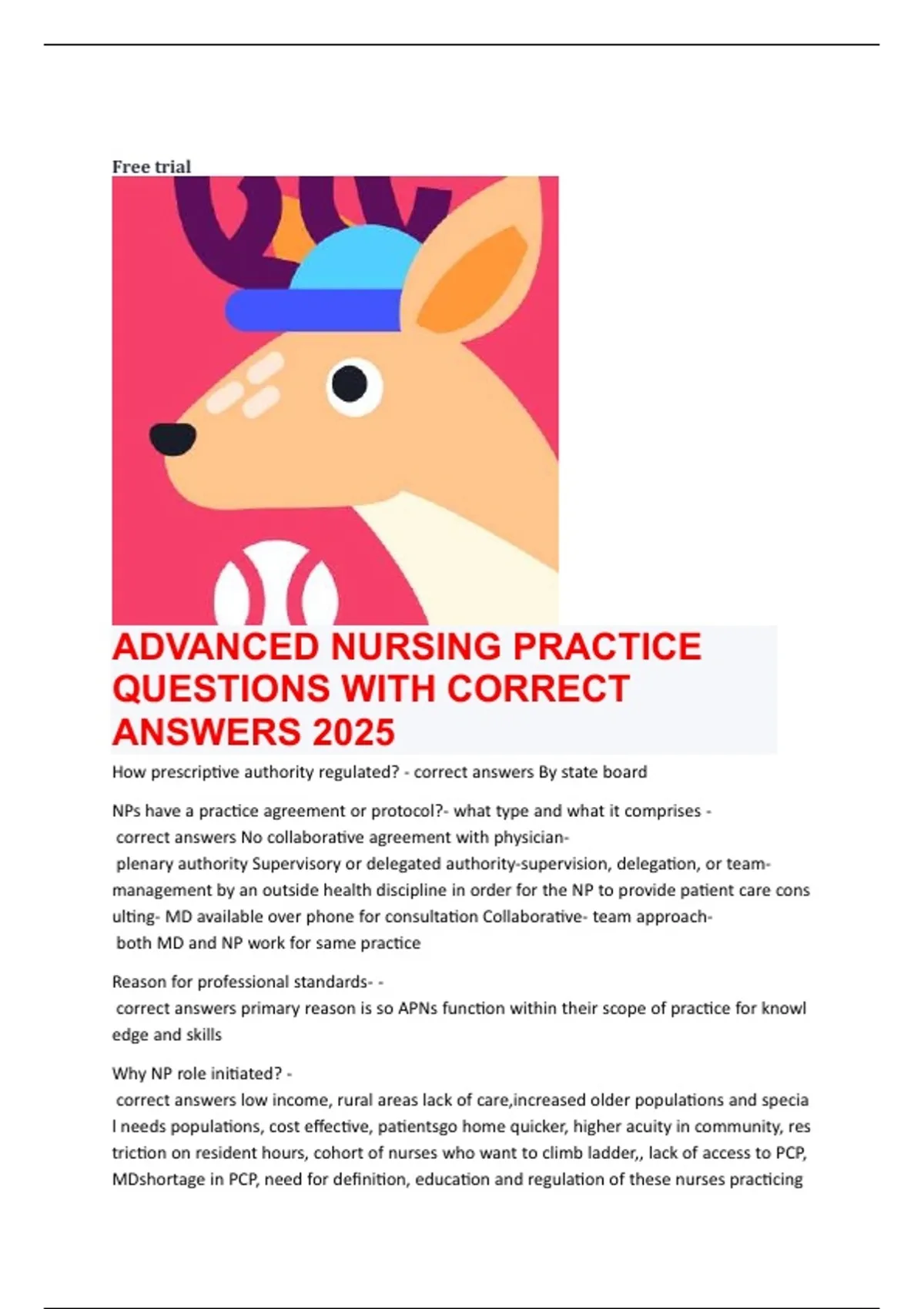 "Welcome to Excellnote! Your ultimate source for high-quality, exam-ready study materials designed to help you excel in your toughest courses and certifications. I specialize in turning complex course material into clear, structured, and verified learning resources." "My library is continually updated and curated to ensure you have the most recent and relevant materials for your academic success. You will find:" -Comprehensive Exam Elaborations: Detailed question-and-answer sets for common exams, certifications, and course assessments. -Verified Solution Manuals: Step-by-step solutions for textbooks and complex problem sets. -Subject-Specific Question Banks: Extensive collections of practice questions with 100% verified answers for subjects like Nursing (HESI, ATI, NCLEX), Finance (CFA), Accounting, IT, and more. -In-Depth Study Guides: Focused summaries and revision notes created from official course materials and recommended texts. -Package Deals: High-value bundles combining multiple documents (like question banks and study guides) for maximum preparation and savings. I as Excellnote am committed to quality and academic rigor:A+ Grade Focus: Every document is meticulously prepared and cross-referenced to target the knowledge required for an A+ grade or a guaranteed exam pass.Timeliness & Accuracy: I prioritize providing the latest versions of study materials, often labeling them with the current academic year (e.g., 2025/2026) to ensure you are studying the most up-to-date content.Structured for Success: Documents feature clear formatting, logical organization, and are designed for quick and effective review, saving you countless hours of preparation time.Buyer Trust & Reputation: I am committed to a high standard of service, as reflected by positive reviews and repeat customers. Your satisfaction is my top priority. "Ready to simplify your study process and boost your grades? Click 'View All Documents' to browse my complete catalog. If you have any questions about a specific document, course, or exam, please feel free to send me a message. I am here to help you achieve academic excellence."