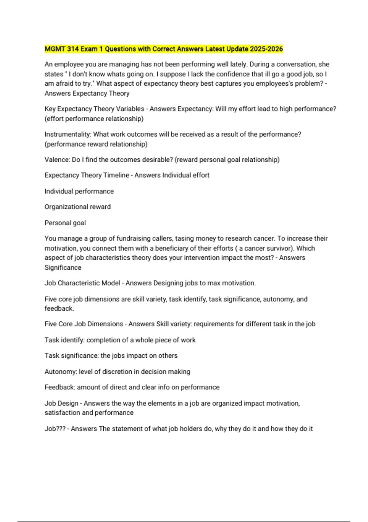 MGMT 314 Exam 1 Questions with Correct Answers Latest Update An employee you are managing has not been performing well lately. During a conversation, she states " I don't know whats going on. I suppose I lack the confidence that ill go a good job, so I am afraid to try." What aspect of expectancy theory best captures you employees's problem? - Answers Expectancy Theory Key Expectancy Theory Variables - Answers Expectancy: Will my effort lead to high performance? (effort performance relationship) Instrumentality: What work outcomes will be received as a result of the performance? (performance reward relationship) Valence: Do I find the outcomes desirable? (reward personal goal relationship) Expectancy Theory Timeline - Answers Individual effort Individual performance Organizational reward Personal goal You manage a group of fundraising callers, tasing money to research cancer. To increase their motivation, you connect them with a beneficiary of their efforts ( a cancer survivor). Which aspect of job characteristics theory does your intervention impact the most? - Answers Significance Job Characteristic Model - Answers Designing jobs to max motivation. Five core job dimensions are skill variety, task identify, task significance, autonomy, and feedback. Five Core Job Dimensions - Answers Skill variety: requirements for different task in the job Task identify: completion of a whole piece of work Task significance: the jobs impact on others Autonomy: level of discretion in decision making Feedback: amount of direct and clear info on performance Job Design - Answers the way the elements in a job are organized impact motivation, satisfaction and performance Job??? - Answers The statement of what job holders do, why they do it and how they do it Which of the following forecasting methods relies on the experience and insight of people in the organization to predict a firms future employees needs? - Answers Judgemental Forecasting Judgemental Forecasting - Answers SMEs estimate company's future labor needs A retail store forecasts a greater need for salespeople during thanksgiving. This is an example of seasonal forecast. - Answers True Seasonal Forecast - Answers Many business demands are seasonal and predictable Why make jobs as motivating as possible? - Answers This places less pressure on many specific areas of HRM: Performance Management and Retention Primary job of manager Motivation is the combined effects on behavior of three choices - Answers Direction: the choice to expend effort Intensity: the choice of the level of effort to expend Persistence: the choice to persist at that level Job Characteristics Model Four primary outcomes - Answers High intrinsic work motivation High quality work performance High job satisfaction Low absenteeism & turnover Job characteristics Model Diagram - Answers Job characteristics: Skill variety Task identity Task significance Autonomy Feedback Psychological states: Meaningfulness of work Responsibility for outcomes Knowledge of results Primary outcomes: Intrinsic motivation Job performance Job satisfaction Turnover and absenteeism Job Enlargement (horizontal expansion) - Answers Redesign of a job to include additional activities (not just switching as in job rotation) Job Rotation (cross-training) - Answers Periodic shifting of an employee from one task to another Reduces boredom, increases motivation Increases training costs, losses in productivity Job Enrichment (vertical expansion) - Answers Increases degree to which a worker handles the planning, execution and evaluation of an activity How does Google motivate their employees to work? - Answers Free lunch, shuttle to work Goal Setting - Answers Internal representation of desired state