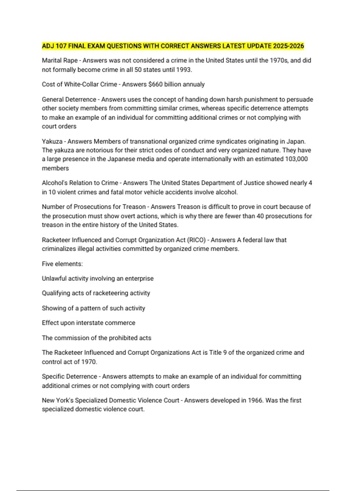 ADJ 107 FINAL EXAM QUESTIONS WITH CORRECT ANSWERS LATEST UPDATE Marital Rape - Answers was not considered a crime in the United States until the 1970s, and did not formally become crime in all 50 states until 1993. Cost of White-Collar Crime - Answers $660 billion annualy General Deterrence - Answers uses the concept of handing down harsh punishment to persuade other society members from committing similar crimes, whereas specific deterrence attempts to make an example of an individual for committing additional crimes or not complying with court orders Yakuza - Answers Members of transnational organized crime syndicates originating in Japan. The yakuza are notorious for their strict codes of conduct and very organized nature. They have a large presence in the Japanese media and operate internationally with an estimated 103,000 members Alcohol's Relation to Crime - Answers The United States Department of Justice showed nearly 4 in 10 violent crimes and fatal motor vehicle accidents involve alcohol. Number of Prosecutions for Treason - Answers Treason is difficult to prove in court because of the prosecution must show overt actions, which is why there are fewer than 40 prosecutions for treason in the entire history of the United States. Racketeer Influenced and Corrupt Organization Act (RICO) - Answers A federal law that criminalizes illegal activities committed by organized crime members. Five elements: Unlawful activity involving an enterprise Qualifying acts of racketeering activity Showing of a pattern of such activity Effect upon interstate commerce The commission of the prohibited acts The Racketeer Influenced and Corrupt Organizations Act is Title 9 of the organized crime and control act of 1970. Specific Deterrence - Answers attempts to make an example of an individual for committing additional crimes or not complying with court orders New York's Specialized Domestic Violence Court - Answers developed in 1966. Was the first specialized domestic violence court. Mass Murder - Answers involves killing 3 or more persons at a single scene with no cooling-off period Serial Murder - Answers is usually reserved for events in which an individual kills a number of individuals over the course of time. The cooling-off period between killings can range from days to years, but the distinction of a cool-off period is what makes serial killing unique from multiple killers Spree Murder - Answers refers to the killing of three or more individuals without any cooling-odd period, usually 2 or more different location Russian Mafia and Human Trafficking - Answers In 2002, the Russian mafia earned annual revenues of $7 billion a year from human trafficking. Unlike other criminal groups, russian organized crime consists of several ethnic groups such as Armenian, Chechen, Georgian, Jewish, Latvian, Lithuanian, Tatar, and Ukrainian from the territory the former Soviet Union. A dominant Russian organized crime group is known as the Vory, which developed among individuals in Soviet prison camp. The definition of human trafficking is the recruitment, harboring, transportation, provision, or obtaining of a person for the purpose of a commercial sex act in which a commercial sex act is induced by force, fraud, or coercion, or in which the person induced to perform such act is under 18, regardless of whether the elements of force, fraud, or coercion are involved. Coercion is a principal tool in the human trafficker's handbook in order for victims to remain under their control. Most Common Stolen Vehicles: - Answers Honda Accord Honda Civic Toyota Camry Toyota Corolla Chevrolet Silverado Characteristics of a Well Skilled Professional Burglar - Answers often gain experience and skill through the years, including technical competence, maintenance of personal integrity, limited financial success, specialization in a specific type of burglary, and the ability to avoid prison sentences. Massachusetts Treatment Center's (M.T.C.) Motivations for Rape - Answers Based on research, the Massachusetts Treatment Center's motivations for rape include opportunity, pervasive anger, sexual gratification, and vindictiveness. Percent of All Murders Resulting from an Argument - Answers 44% Percent of All Homicide as it Relates to Violent Crime - Answers 1-2% Malice Aforethought - Answers usually refers to premeditation or the state of mind an individual was in during the crime. In this case, the individual thought ahead, planned, and voluntarily caused the death of another without legal excuse or justification Percent of the Suicide Attacks Carried Out by Hamas - Answers 40% Sibling Violence - Answers the most common form of domestic violence in America Mafia - Answers means protection against the arrogance of the powerful, remedy to any damage, sturdiness of body strength and serenity of spirit, and the best and most exquisite part of life. Nicholas Groth's Rape Categories - Answers Anger rape Power rape Sadistic rape