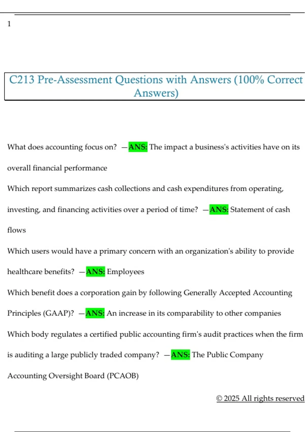 C213 Pre-Assessment Questions with Answers (100% Correct