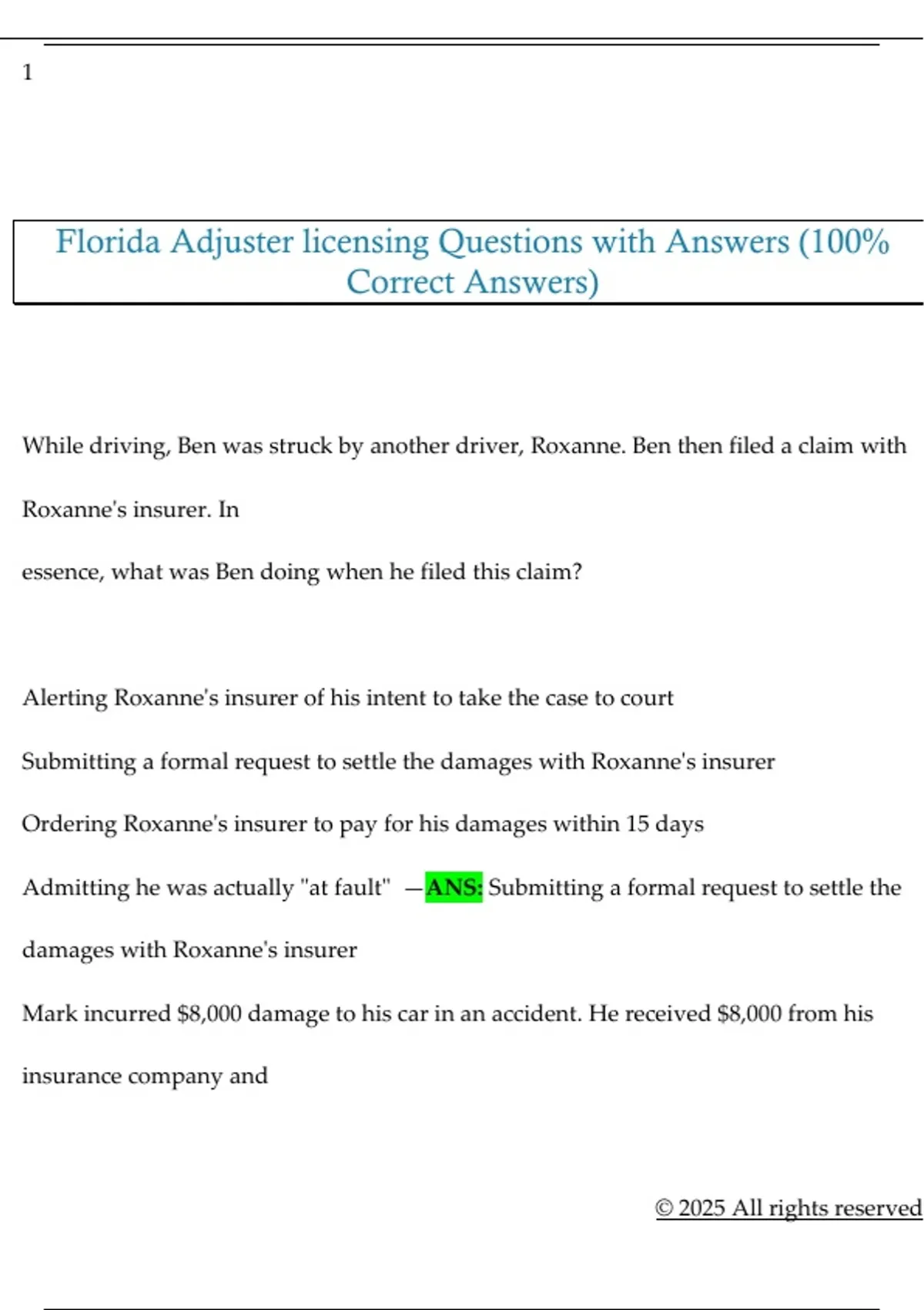 Florida Adjuster licensing Questions with Answers (100%
