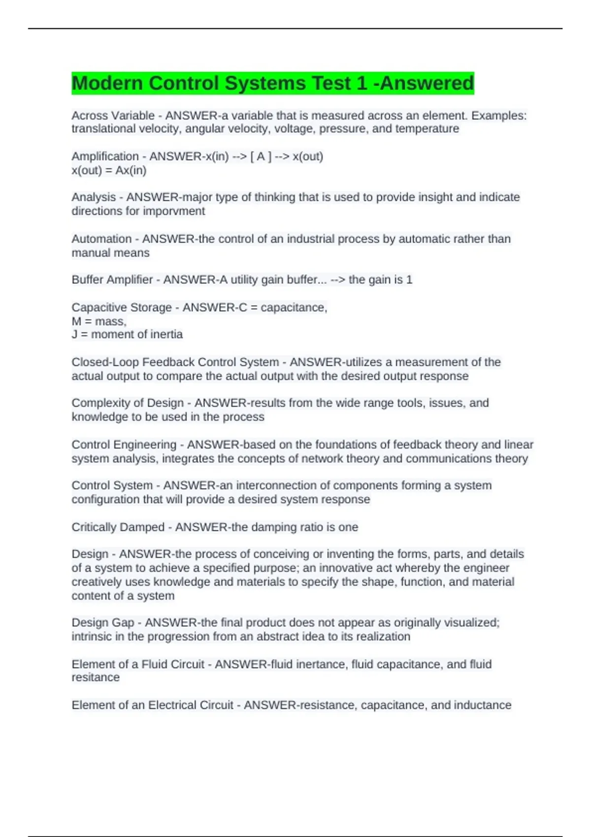 Control Engineering - ANSWER-based on the foundations of feedback theory and linear