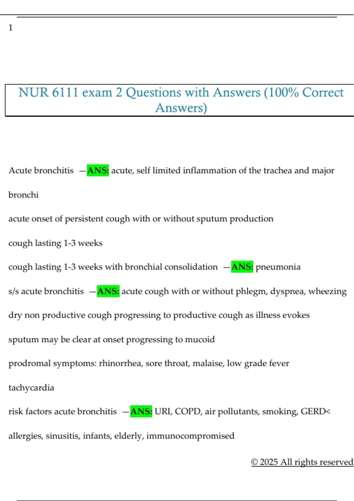 Acute bronchitis —ANS: acute, self limited inflammation of the trachea and major
