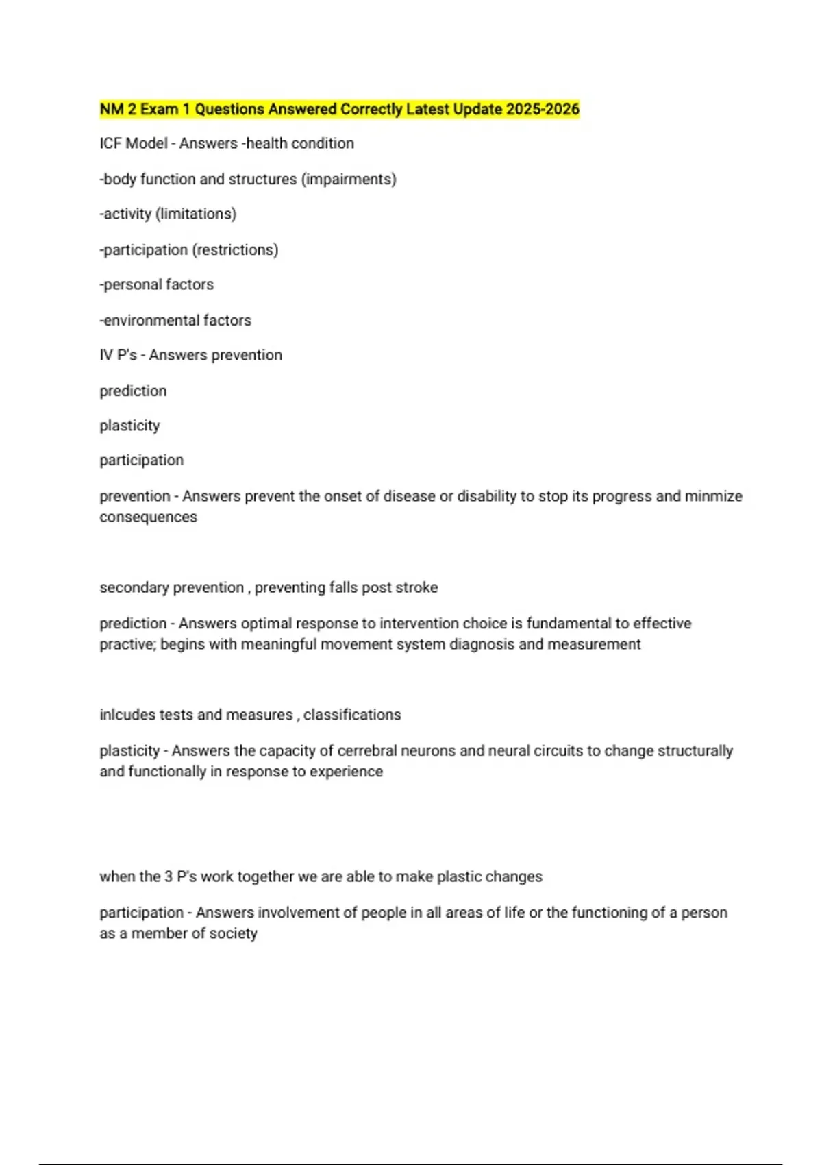 NM 2 Exam 1 Questions Answered Correctly Latest Update ICF Model - Answers -health condition -body function and structures (impairments) -activity (limitations) -participation (restrictions) -personal factors -environmental factors IV P's - Answers prevention prediction plasticity participation prevention - Answers prevent the onset of disease or disability to stop its progress and minmize consequences secondary prevention , preventing falls post stroke prediction - Answers optimal response to intervention choice is fundamental to effective practive; begins with meaningful movement system diagnosis and measurement inlcudes tests and measures , classifications plasticity - Answers the capacity of cerrebral neurons and neural circuits to change structurally and functionally in response to experience when the 3 P's work together we are able to make plastic changes participation - Answers involvement of people in all areas of life or the functioning of a person as a member of society includes barriers to participations soliciting pt experiences and preferences prediciton , participation and prevention all point towards - Answers plasticity Restorative interventions: - Answers focus on targeted movement deficiencies and utilized activity based interventions and motor learning strategies. To be most effective utilize 3 elements: (1) repetitive and intense practice of task oriented functional activities, (2) strategies that enhance active motor learning and adherence-enhancing behaviors, and (3) strategies that encourage use of more-impaired body segments while limiting use of less-impaired body segments Impairment Specific and Augmented Interventions: - Answers hands-on approach to training for patients with limited motor function who are unable to perform voluntary movements or have limited control. Examples: PNF, NDT. Compensatory Interventions: - Answers Indicated for patients with severe movement deficiencies, limited recovery potential, and multiple comorbidities and impairments. These interventions are designed to promote early resumption of function by using altered movement strategies, focusing on using less-involved body segments for function, assistive devices, and environmental adaptation. Augmented - - Answers Hands-on approach to training and includes guided, assisted, or facilitated movements. Indicated for patients during early recovery who are unable to perform voluntary movements or have limited control. impairment-specific interventions - Answers interventions - target specific impairments (contracture, weakness, etc.) may be necessary during the course of treatment but should not be primary focus of treatment as the intended outcome is functional independence. Remediation of specific impairments can be built into functional activity training. Compensatory - - Answers Designed to promote early resumption of function. Interventions include altered movement strategies, focus on using less-involved body segment, assistive devices, and environmental adaptation NDT originated from the . - Answers reflex and hierarchical motor control theories. It has adapted to include the systems/contemporary task-oriented approach over time Postural control is considered foundational for learning motor skills. True False - Answers True