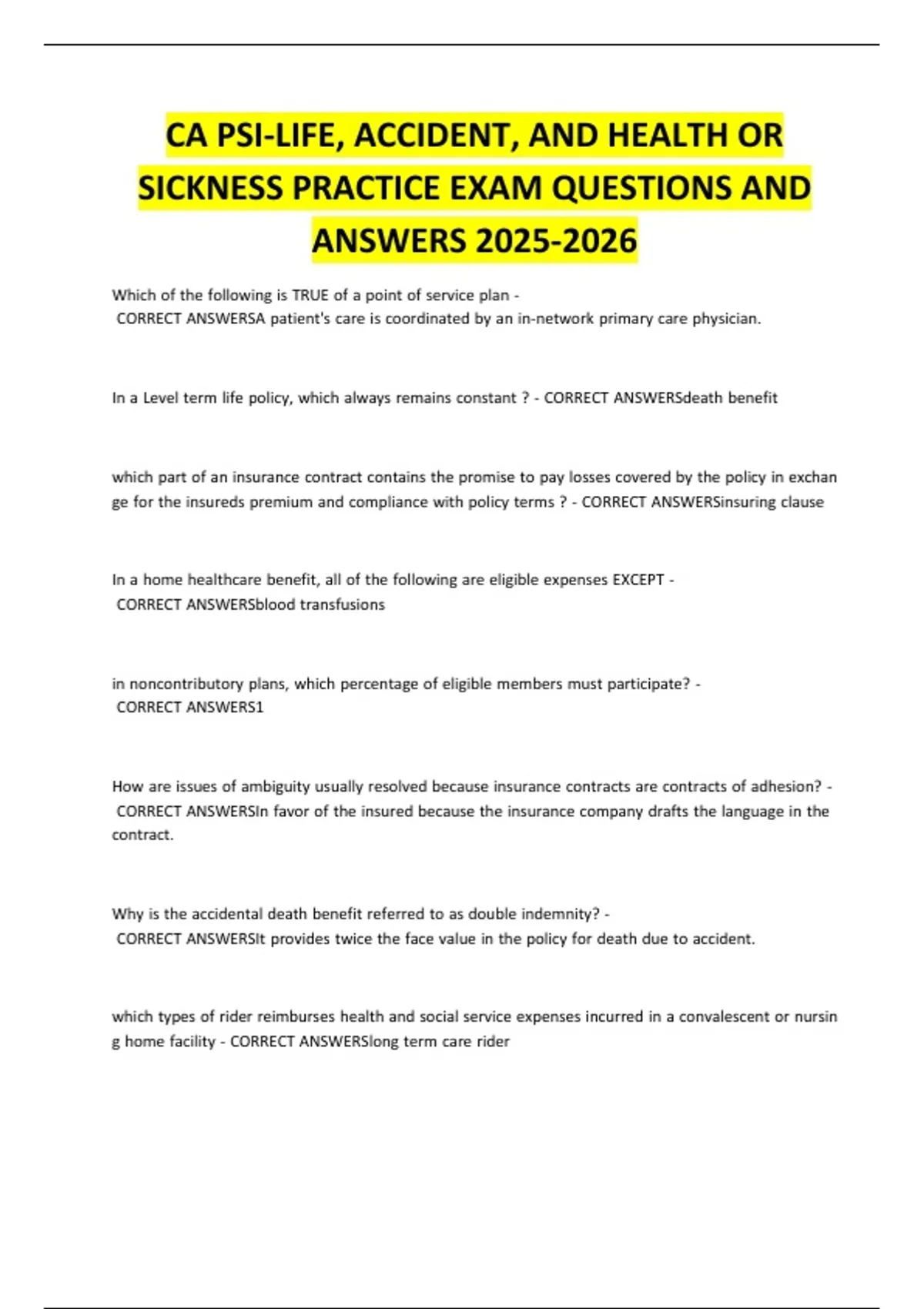 CA PSI-LIFE, ACCIDENT, AND HEALTH OR SICKNESS PRACTICE EXAM QUESTIONS AND ANSWERS 2025-