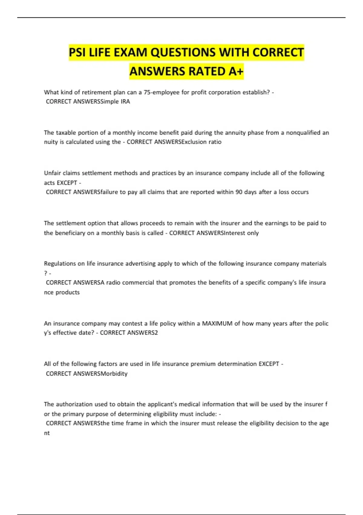 PSI LIFE EXAM QUESTIONS WITH CORRECT ANSWERS RATED A