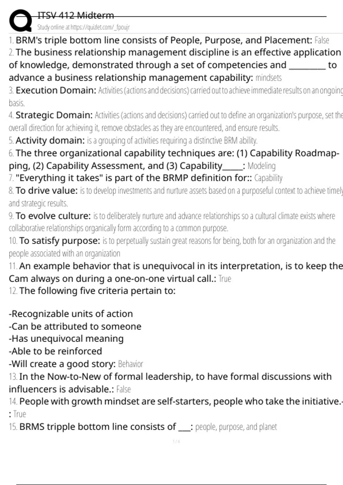 1. BRM's triple bottom line consists of People, Purpose, and Placement: False
