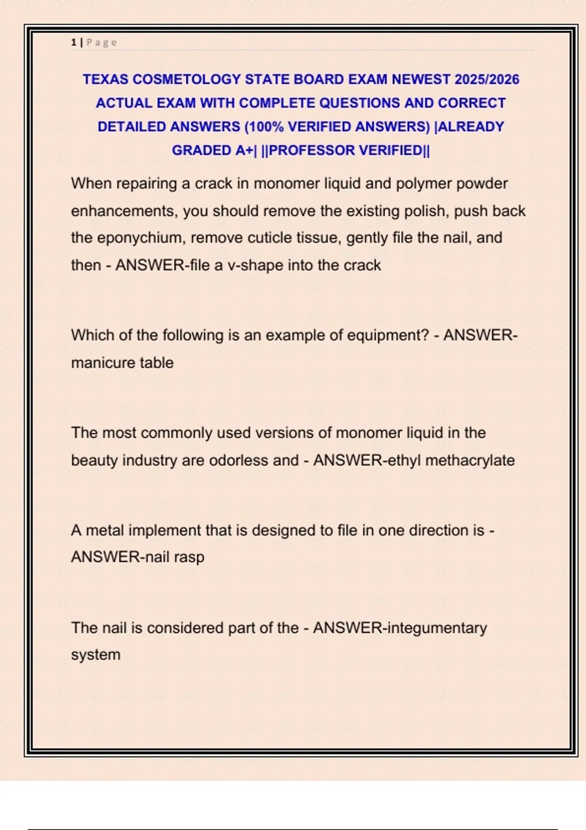 TEXAS COSMETOLOGY STATE BOARD EXAM NEWEST 2025/2026 ACTUAL EXAM WITH COMPLETE QUESTIONS AND CORRECT DETAILED ANSWERS (100% VERIFIED ANSWERS) |ALREADY GRADED A+| ||PROFESSOR VERIFIED||TEXAS COSMETOLOGY STATE BOARD EXAM NEWEST 2025/2026 ACTUAL EXAM WITH