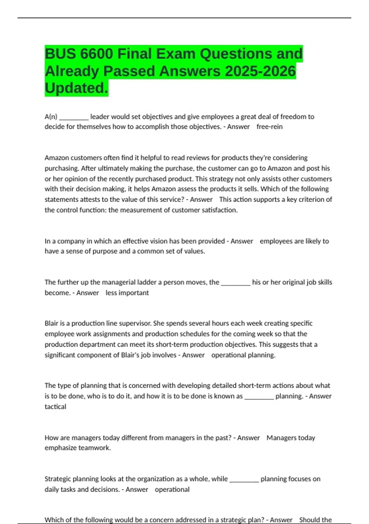 BUS 6600 Final Exam Questions and Already Passed Answers Updated.