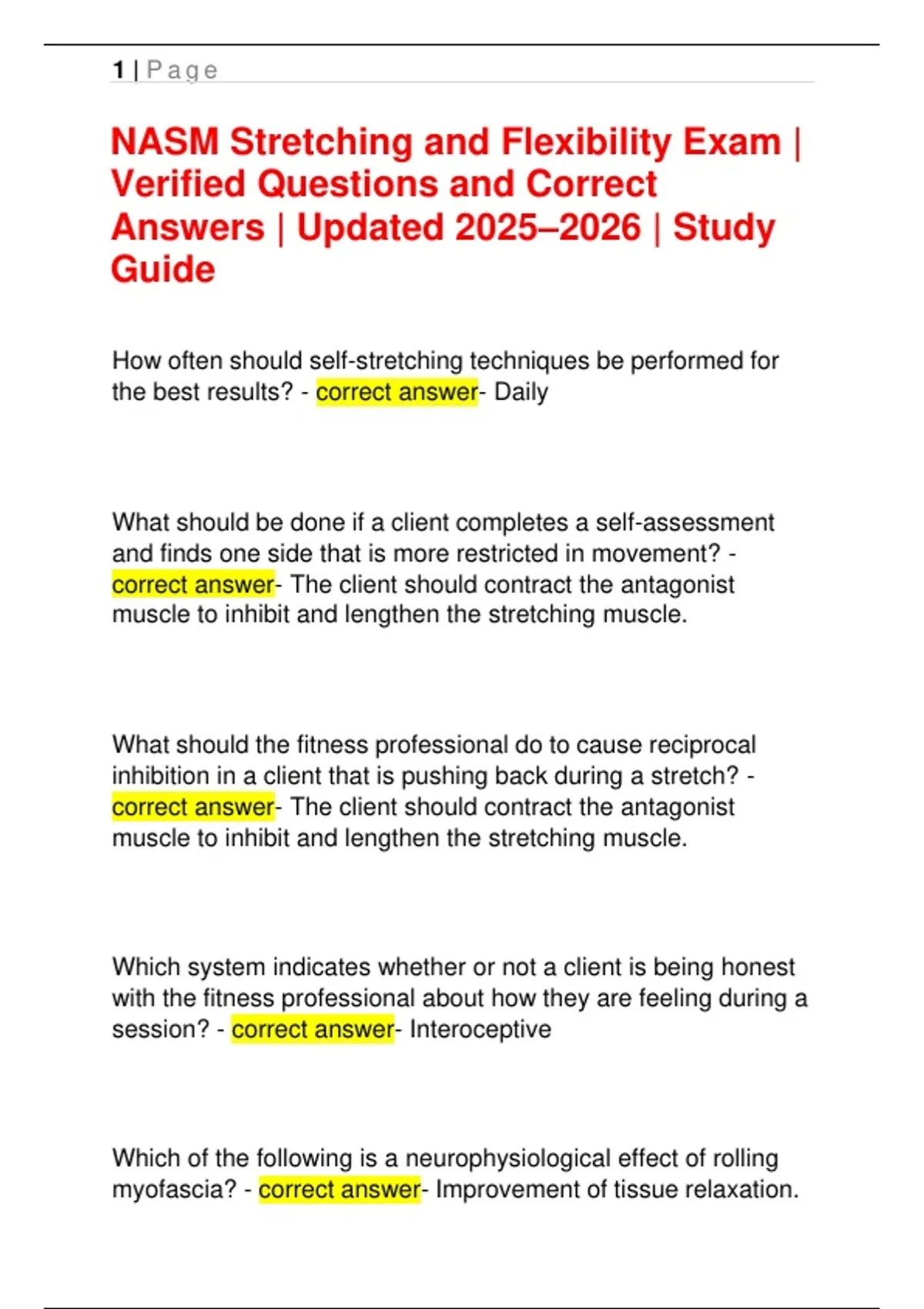 Get ready for the NASM Stretching and Flexibility Exam with this updated 2025–2026 study guide. It includes verified questions and correct answers, aligned with NASM’s latest certification standards to help you prepare confidently and efficiently. The guide covers core topics such as flexibility assessments, stretching techniques, movement preparation, muscle imbalances, and corrective strategies. Each question is clearly explained, helping you understand the reasoning behind each correct answer. Perfect for NASM students and fitness professionals, this verified study resource offers clear, accurate, and exam-focused content to help you pass your Stretching and Flexibility module with ease.