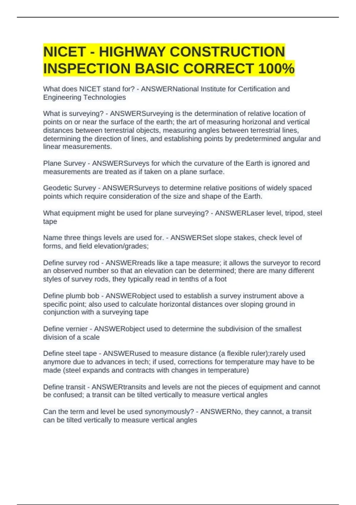 NICET - HIGHWAY CONSTRUCTION INSPECTION BASIC CORRECT 100%