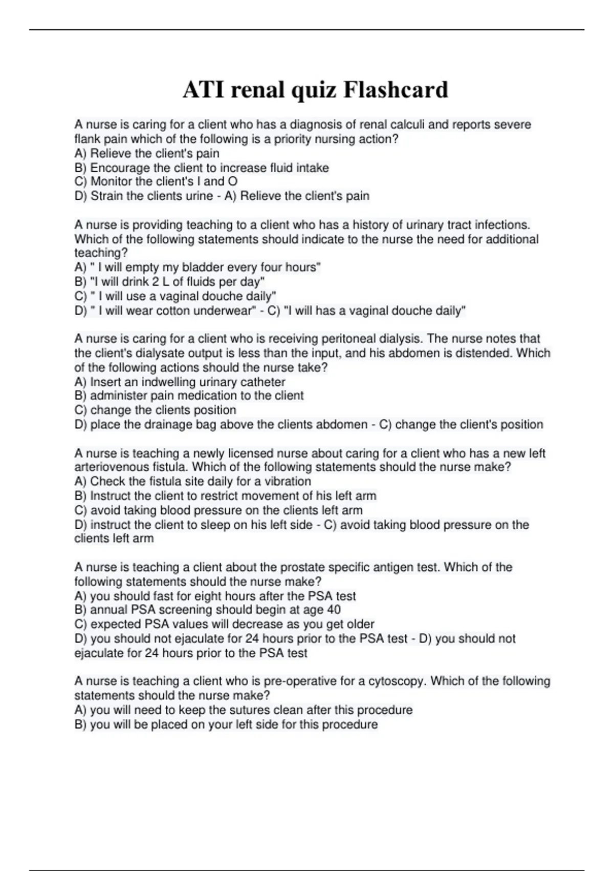 ATI Renal Quiz Practice Questions | Urinary Disorders, Dialysis, & Post-Op Care