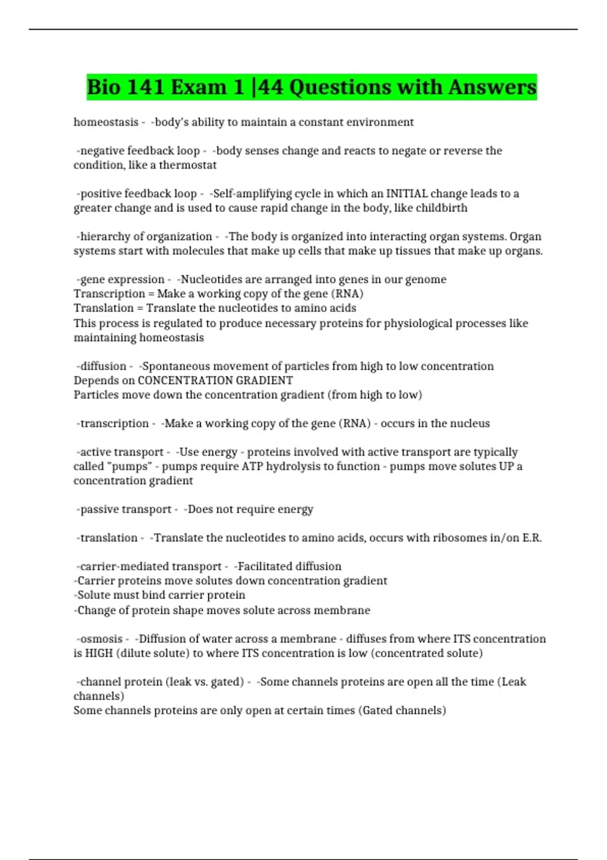 Bio 141 Exam 1 |44 Questions with Answers