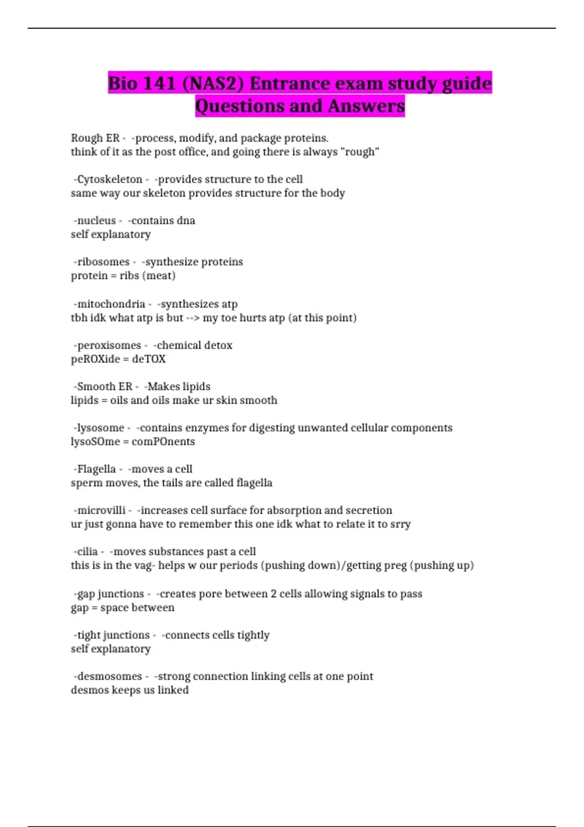 Bio 141 (NAS2) Entrance exam study guide