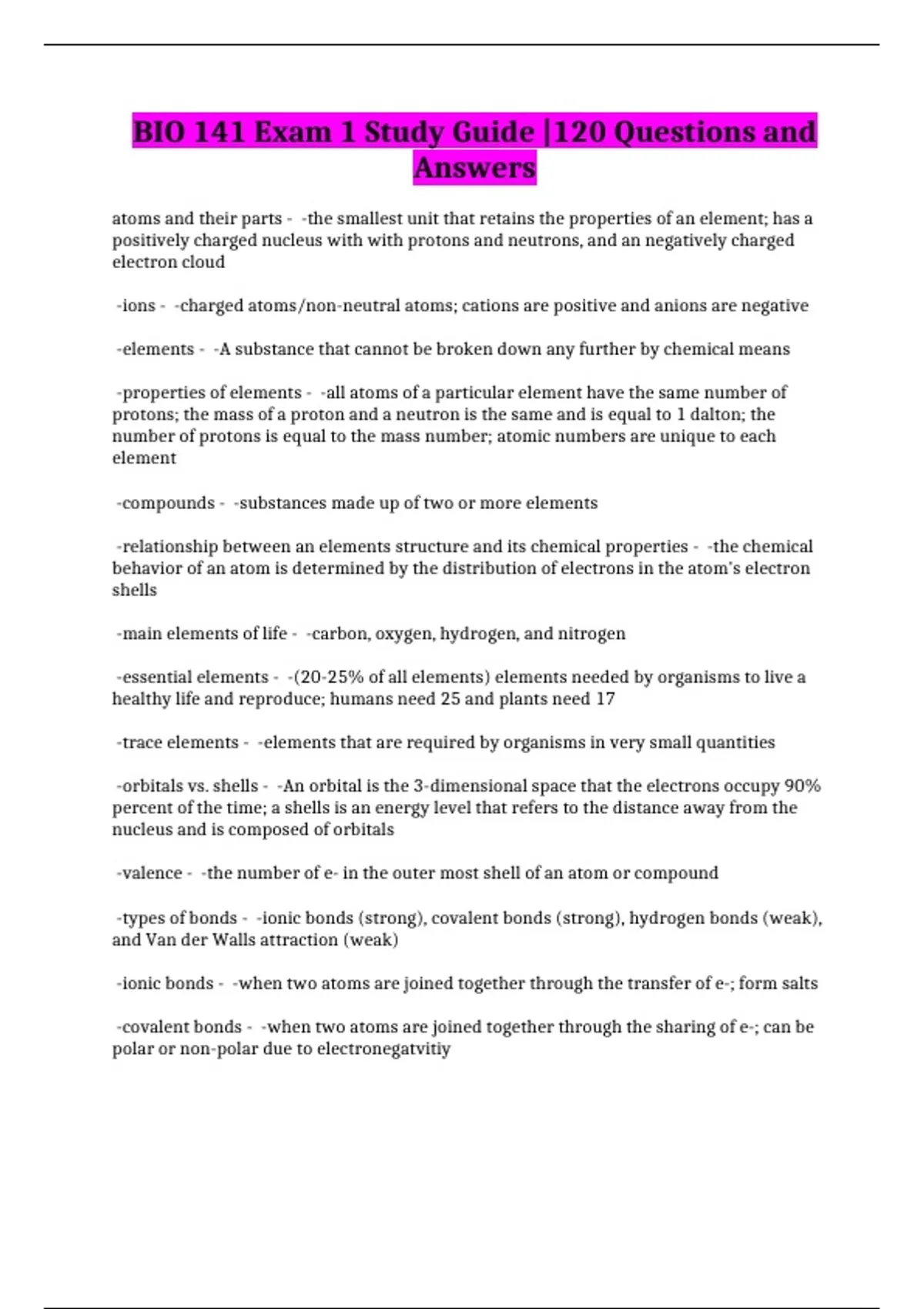 BIO 141 Exam 1 Study Guide |120 Questions and