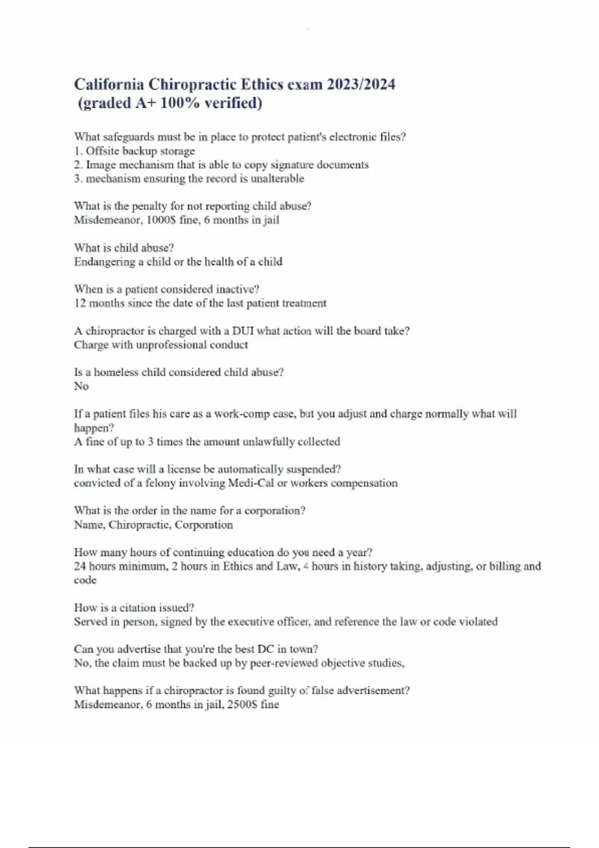 California Chiropractic Ethics exam 2023/2024 (graded A+ 100% verified) What safeguards must be in place to protect patient's electronic files? 1. Offsite backup storage 2. Image mechanism that is able to copy signature documents 3. mechanism ensuring the record is unalterable What is the penalty for not reporting child abuse? Misdemeanor, 1000$ fine, 6 months in jail What is child abuse? Endangering a child or the health of a child When is a patient considered inactive? 12 months since the date of the last patient treatment A chiropractor is charged with a DUI what action will the board take? Charge with unprofessional conduct Is a homeless child considered child abuse? No If a patient files his care as a work-comp case, but you adjust and charge normally what will happen? A fine of up to 3 times the amount unlawfully collecte