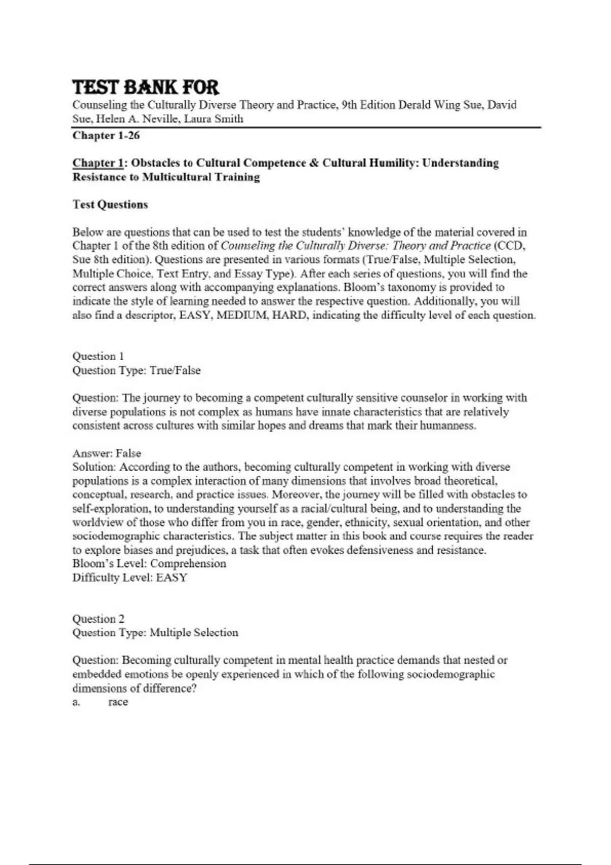 Test Bank For Counseling the Culturally Diverse Theory and Practice 9th Edition (Chapter 1-26) by Derald Wing Sue, David Sue, Helen A. Neville, Laura Smith