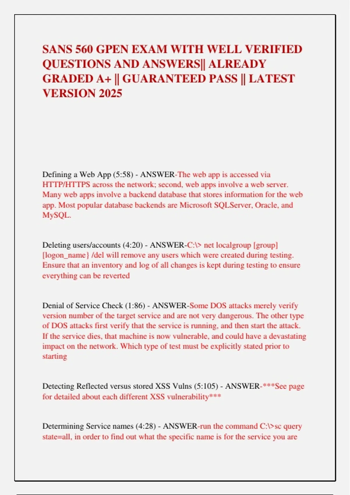 SANS 560 GPEN EXAM WITH WELL VERIFIED QUESTIONS AND ANSWERS|| ALREADY GRADED A+ || GUARANTEED PASS || LATEST VERSION 2025 Defining a Web App (5:58) - ANSWER-The web app is accessed via HTTP/HTTPS across the network; second, web apps involve a web server. Many web apps involve a backend database that stores information for the web app. Most popular database backends are Microsoft SQLServer, Oracle, and MySQL. Deleting users/accounts (4:20) - ANSWER-C:> net localgroup [group] [logon_name} /del will remove any users which were created during testing. Ensure that an inventory and log of all changes is kept during testing to ensure everything can be reverted Denial of Service Check (1:86) - ANSWER-Some DOS attacks merely verify version number of the target service and are not very dangerous. The other type of DOS attacks first verify that the service is running, and then start the attack. If the service dies, that machine is now vulnerable, and could have a devastating impact on the network. Which type of test must be explicitly stated prior to starting Detecting Reflected versus stored XSS Vulns (5:105) - ANSWER-***See page for detailed about each different XSS vulnerability*** Determining Service names (4:28) - ANSWER-run the command C:>sc query state=all, in order to find out what the specific name is for the service you are trying to interact with. You man also type to invoke the services GUI and look for the specific service you want. Determining which client-side Programs are used (3:14) - ANSWER-Some target network personnel may provide any information the tester is looking for. Secondly, you can analyze metadata in any documents the target organization has provided. You could also use User-Agent strings when the customer surfs to your network to find out what type of browsers they are using Dig Command (1:143) - ANSWER-In modern Linux Distro's the NSLookup command can no longer perform zone transfers. The DIG command can now provide this functionality Obtaining Windows PW Representations (4:138) - ANSWER-Meterpreter has a hashdump feature in the priv module to extract hashes. This rides over attacker to-Meterpreter comm channels and not typcial NetBIOS & SMB ports. The Mimikatz tool pulls hashes and possibly clear text passwords from memory, combing through Windows machine's LSASS process in various areas looking for stored auth creds. On a domain controller the tester could use the Volume Shadow Copy service (VSS) to create a copy of the file and then parse it using the suite of parsing tools from Csaba Barta. sniff challenge/response traffic from the network as a user mounts a file share and authenticates to the domain. Open Source Security Testing Methodology Manual (OSSTMM) (1:24) - ANSWER-Document that is focused on improving the transparency of enterprise security, as well as the methodology of the testers. Also strives for repeatability, consistency, and high quality in numerous kinds of security tests. Topics addressed include scoping, metrics, human security testing, and data network testing Open Web Application Security Project (OWASP) (1:28) - ANSWER Document focuses purely on web app testing. Detailed description of determining the business risk posed by findings. OpenVAS (2:116) - ANSWER-Completely free vulnerability scanner. While new plugins are distributed with and for OpenVAS, the commercial version of Nessus is still 50% faster and has more plugins. Orrey, Kev (Toggmeister) (1:29) - ANSWER-Wrote Pentesting Framework Network Infrastructure Firewall Concerns (1:44) - ANSWER-When testing machines across the internet, firewalls may block inbound/outbound packets and could lead to inaccurate results Network Services Test (1:20) - ANSWER-Involves finding target systems on a network, looking for openings in their underlying operating systems and available network services, then exploiting them remotely. Can happen remotely across the internet against org's perimeter network or from within their own facilities, to evaluate the security of the internal network or DMZ Network Sweeping (2:6) - ANSWER-Identifies which addresses are in use by sending probe packets to all network addresses in the target range. If a response is received there is an active system Network Tracing (2:6) - ANSWER-closely related activity to network sweeping, in which we attempt to discern the topology of the target network by drawing a network map NeXCSer Tool (2:120) - ANSWER-Designed by Robin Wood, is a great script for merging Nessus result reports and converting them into a CSV. Nickerson, Chris (1:26) - ANSWER-Lead for developing Penetration Testing Execution Standard (PTES)
