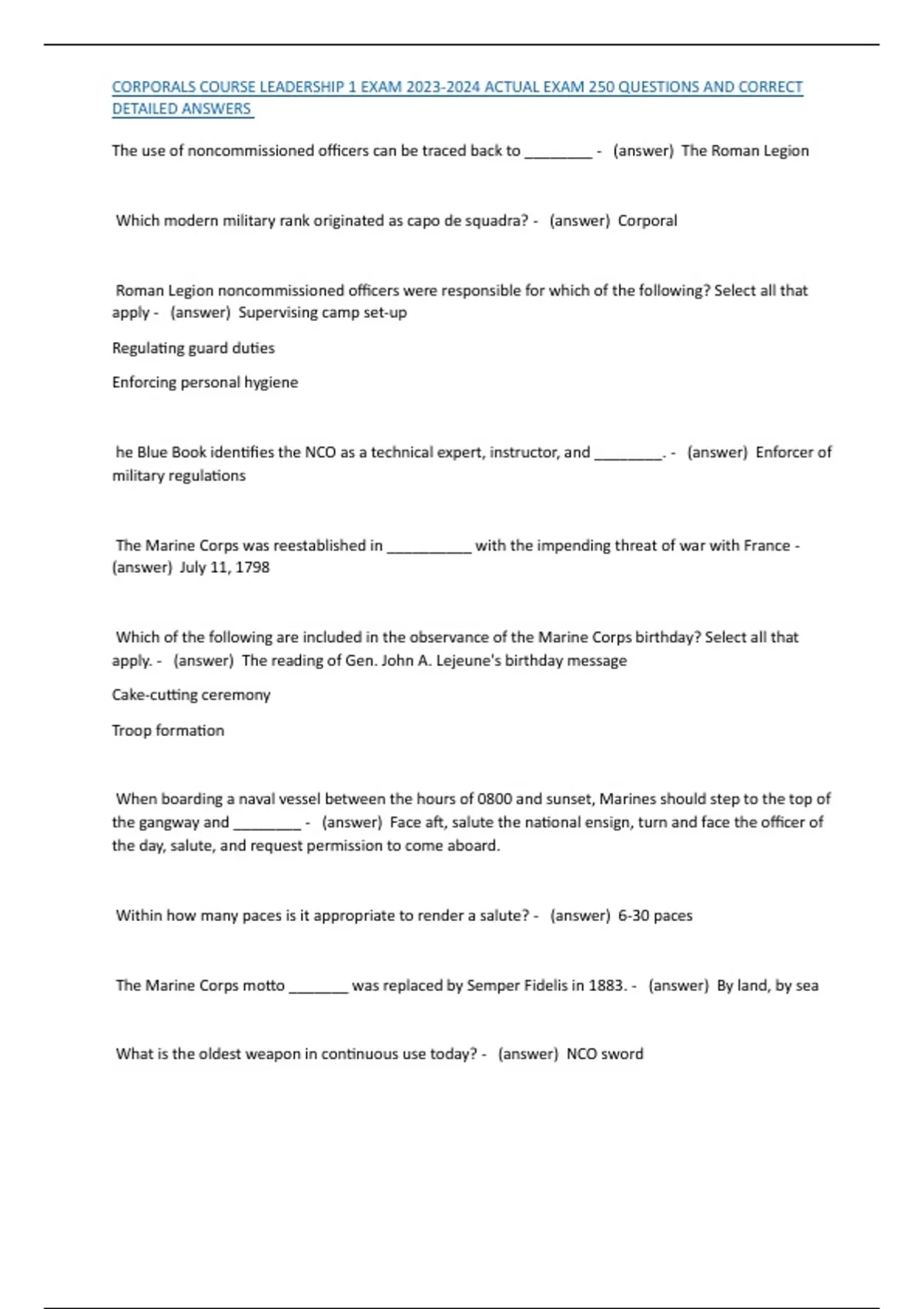 , CORPORALS COURSE LEADERSHIP 1 EXAM 2023-2024 ACTUAL EXAM 250 QUESTIONS AND CORRECT