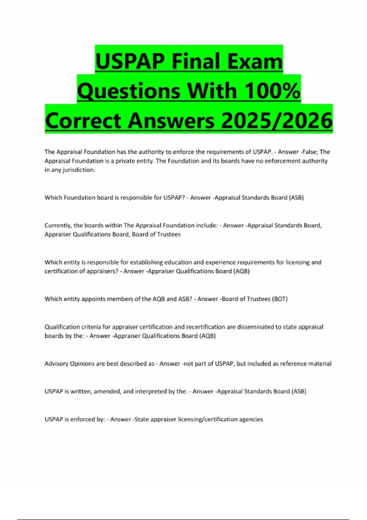 USPAP Final Exam Questions With 100% Correct Answers 2025/2026 The Appraisal Foundation has the authority to enforce the requirements of USPAP. - Answer -False; The Appraisal Foundation is a private entity. The Foundation and its boards have no enforcement authority in any jurisdiction. Which Foundation board is responsible for USPAP? - Answer -Appraisal Standards Board (ASB) Currently, the boards within The Appraisal Foundation include: - Answer -Appraisal Standards Board, Appraiser Qualifications Board, Board of Trustees Which entity is responsible for establishing education and experience requirements for licensing and certification of appraisers? - Answer -Appraiser Qualifications Board (AQB) Which entity appoints members of the AQB and ASB? - Answer -Board of Trustees (BOT) Qualification criteria for appraiser certification and recertification are disseminated to state appraisal boards by the: - Answer -Appraiser Qualifications Board (AQB) Advisory Opinions are best described as - Answer -not part of USPAP, but included as reference material USPAP is written, amended, and interpreted by the: - Answer -Appraisal Standards Board (ASB) USPAP is enforced by: - Answer -State appraiser licensing/certification agenciesWhich is NOT a responsibility of the Appraisal Subcommittee (ASC)? - Answer -Writing, interpreting, and amending USPAP WRONG Answers: Monitoring the practices, procedures, and activities of The Appraisal Foundation, Maintaining a National Registry of licensed and certified appraisers, Overseeing each state's appraiser licensing and certification program are handled by the ASC Which entity maintains the official National Registry of state-certified and licensed appraisers? - Answer -Appraisal Subcommittee (ASC) Who is responsible for issuing credentials to individual appraisers? - Answer -State appraisal regulatory agencies Why are USPAP Advisory Opinions issued? - Answer -To offer advice Which of these is considered an integral part of USPAP and has the same weight as the components they address? - Answer -Comments Which part of USPAP establishes the requirements for workfile content for an appraisal or appraisal review assignment? - Answer -RECORD KEEPING RULE In USPAP, the appraisal process is divided into two distinct types of activity: _________ and __________. - Answer -Development, reporting The first step in the appraisal process is: - Answer -Identify the problem