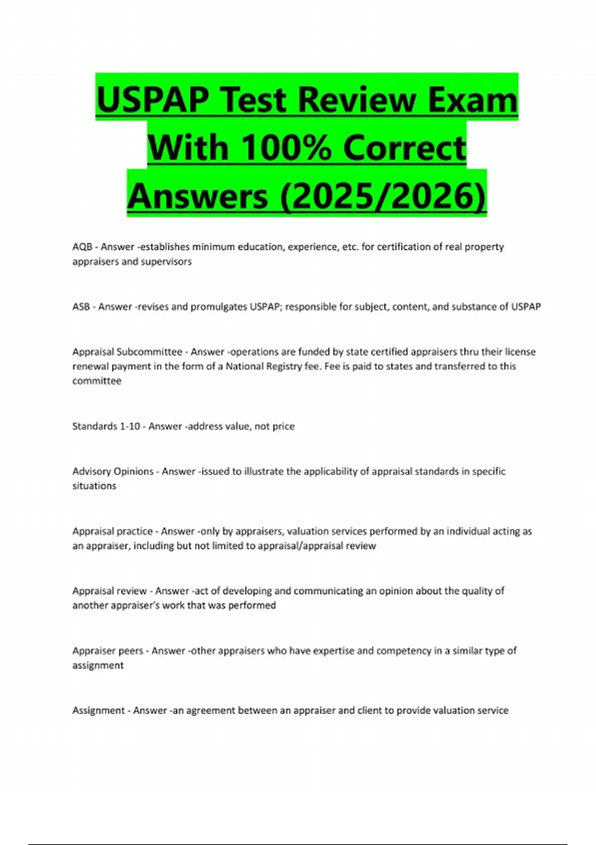 USPAP Test Review Exam With 100% Correct Answers (2025/2026) AQB - Answer -establishes minimum education, experience, etc. for certification of real property appraisers and supervisors ASB - Answer -revises and promulgates USPAP; responsible for subject, content, and substance of USPAP Appraisal Subcommittee - Answer -operations are funded by state certified appraisers thru their license renewal payment in the form of a National Registry fee. Fee is paid to states and transferred to this committee Standards 1-10 - Answer -address value, not price Advisory Opinions - Answer -issued to illustrate the applicability of appraisal standards in specific situations Appraisal practice - Answer -only by appraisers, valuation services performed by an individual acting as an appraiser, including but not limited to appraisal/appraisal review Appraisal review - Answer -act of developing and communicating an opinion about the quality of another appraiser's work that was performed Appraiser peers - Answer -other appraisers who have expertise and competency in a similar type of assignment Assignment - Answer -an agreement between an appraiser and client to provide valuation serviceAssignment results - Answer -an appraiser's opinions or conclusion developed specific to an assignment Client - Answer -the party who engage, by employment/contract, an appraiser in a specific assignment Value - Answer -the monetary relationship between properties and those buy, sell, use properties
