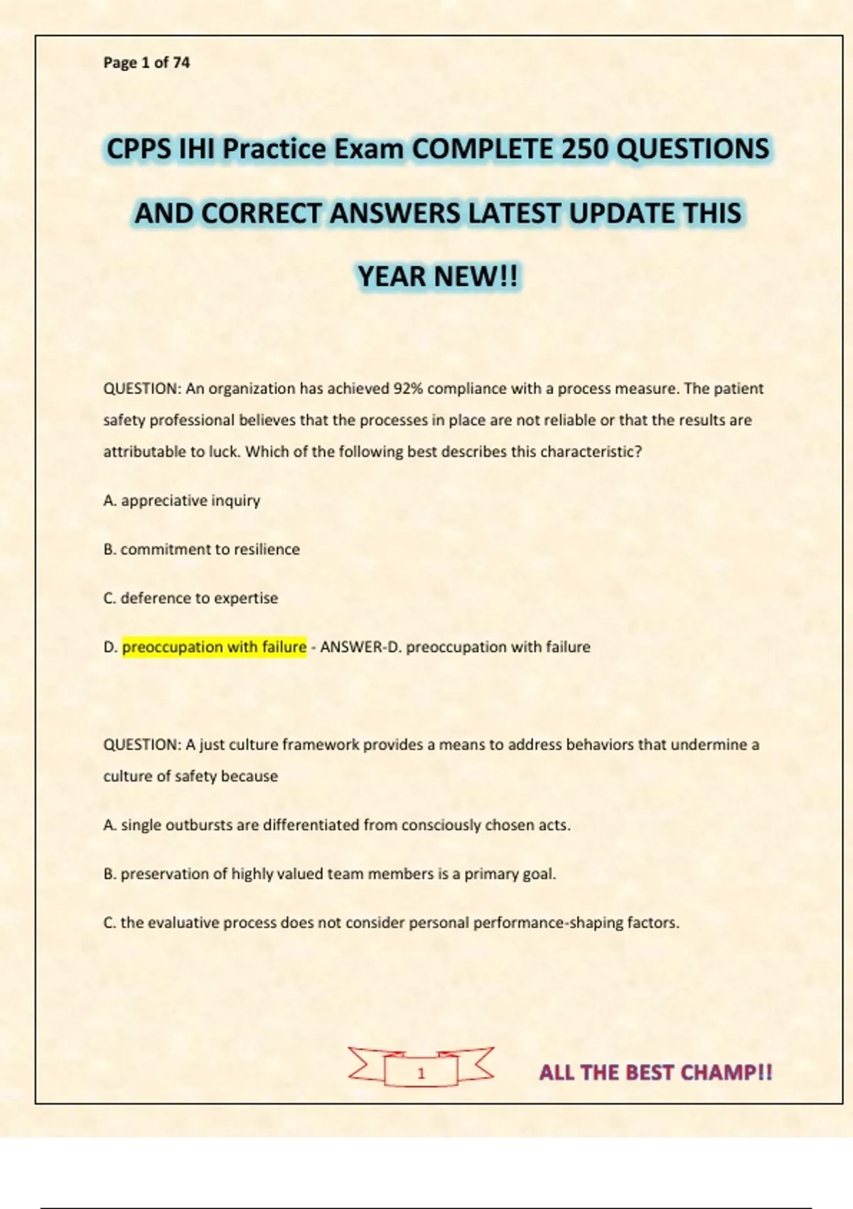 CPPS IHI Practice Exam COMPLETE 250 QUESTIONS