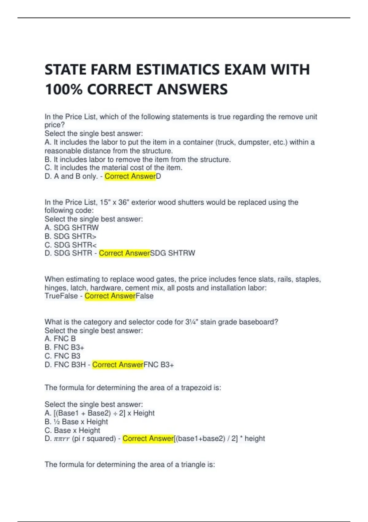 STATE FARM ESTIMATES EXAMS WITH ACCURATE ANSWERS