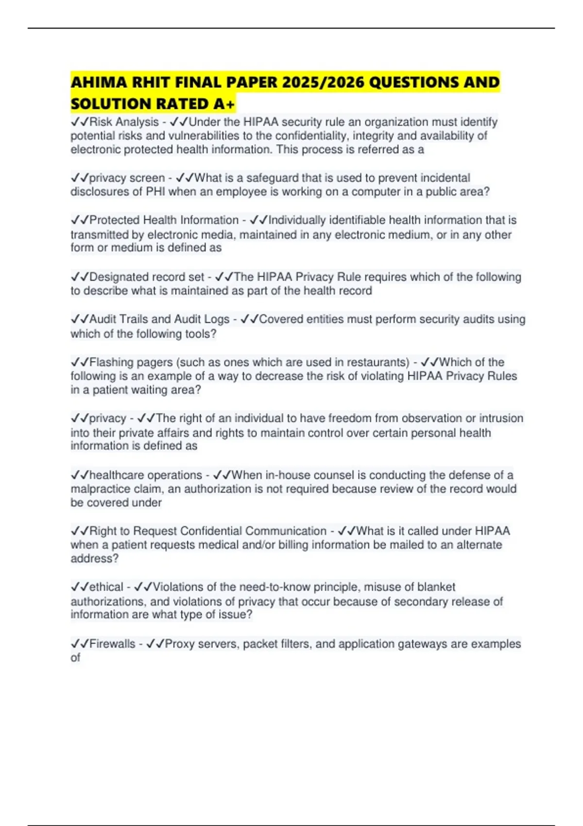 AHIMA RHIT FINAL PAPER 2025/2026 QUESTIONS AND SOLUTION RATED A+
