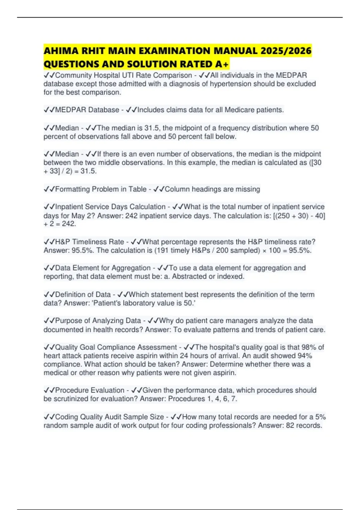 ✔✔Quality Goal Compliance Assessment - ✔✔The hospital's quality goal is that 98% of